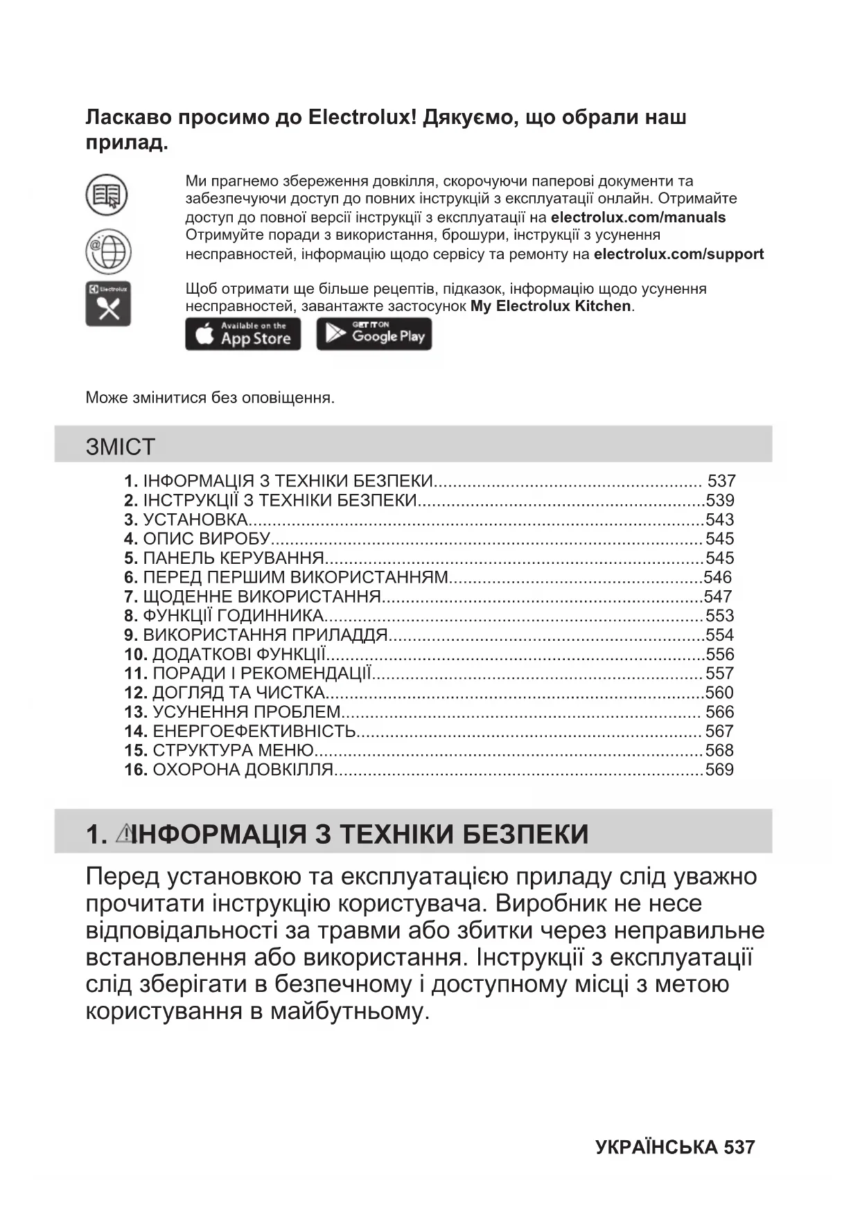 Ми прагнемо збереження довкілля, скорочуючи паперові документи тазабезпечуючи доступ до повних інструкцій з експлуатації онлайн. Отримайтедоступ до повної версії інструкції з експлуатації на electrolux.com/manualsОтримуйте поради з використання, брошури, інструкції з усуненнянесправностей, інформацію щодо сервісу та ремонту на electrolux.com/supportЩоб отримати ще більше рецептів, підказок, інформацію щодо усуненнянесправностей, завантажте застосунок My Electrolux Kitchen.Може змінитися без оповіщення. 1. ІНФОРМАЦІЯ З ТЕХНІКИ БЕЗПЕКИ........................................................ 5372. ІНСТРУКЦІЇ З ТЕХНІКИ БЕЗПЕКИ............................................................539