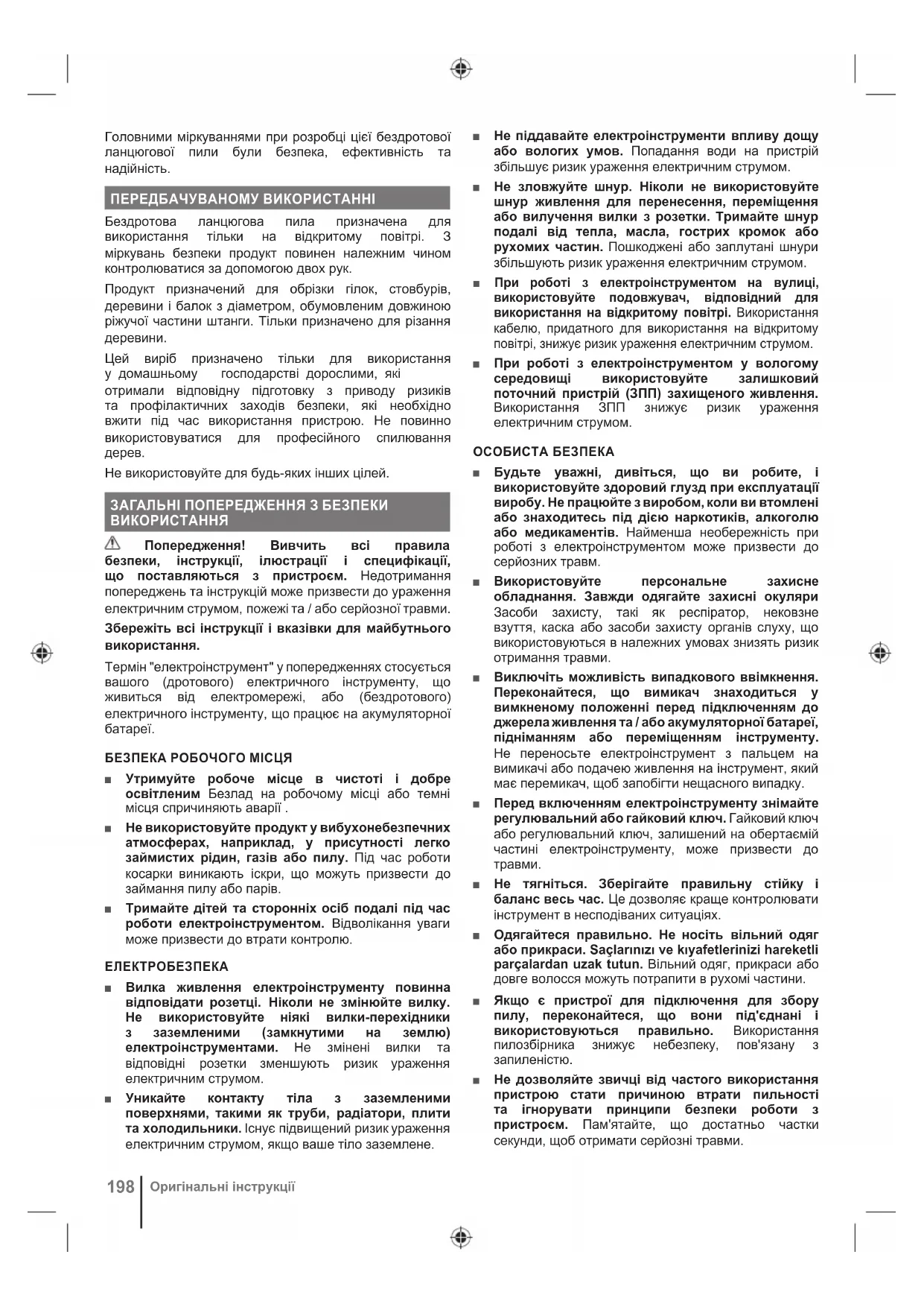 дроселната клапа. ЗАБЕЛЕЖКА: За да спрете изделието: За да използвате верижната спирачка, завъртете лявата си ръка около предната ръкохватка. Натискайте лоста на спирачката към щангата с външната страна на ръката си, докато веригата се върти бързо. Освободете спусъка на превключвателя.198 Оригінальні інструкції Головними міркуваннями при розробці цієї бездротової ланцюгової пили були безпека, ефективність та надійність. ПЕРЕДБАЧУВАНОМУ ВИКОРИСТАННІ Бездротова ланцюгова пила призначена для використання тільки на відкритому повітрі. З міркувань безпеки продукт повинен належним чином контролюватися за допомогою двох рук. Продукт призначений для обрізки гілок, стовбурів, деревини і балок з діаметром, обумовленим довжиною ріжучої частини штанги. Тільки призначено для різання