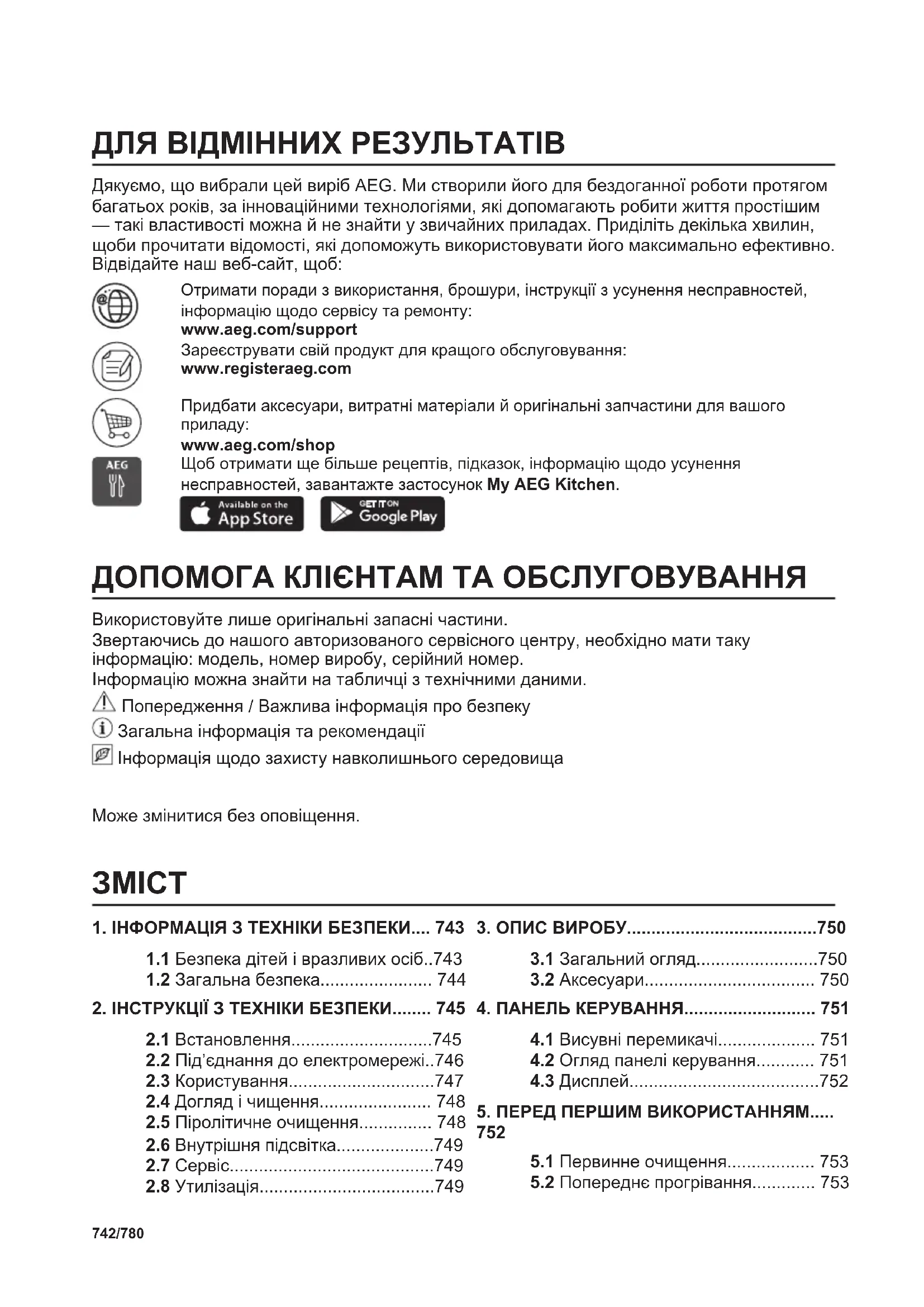 www.aeg.com/shop Щоб отримати ще більше рецептів, підказок, інформацію щодо усунення несправностей, завантажте застосунок My AEG Kitchen. ДОПОМОГА КЛІЄНТАМ ТА ОБСЛУГОВУВАННЯ Використовуйте лише оригінальні запасні частини. Звертаючись до нашого авторизованого сервісного центру, необхідно мати таку інформацію: модель, номер виробу, серійний номер. Інформацію можна знайти на табличці з технічними даними. Попередження / Важлива інформація про безпеку Загальна інформація та рекомендації Інформація щодо захисту навколишнього середовища Може змінитися без оповіщення.