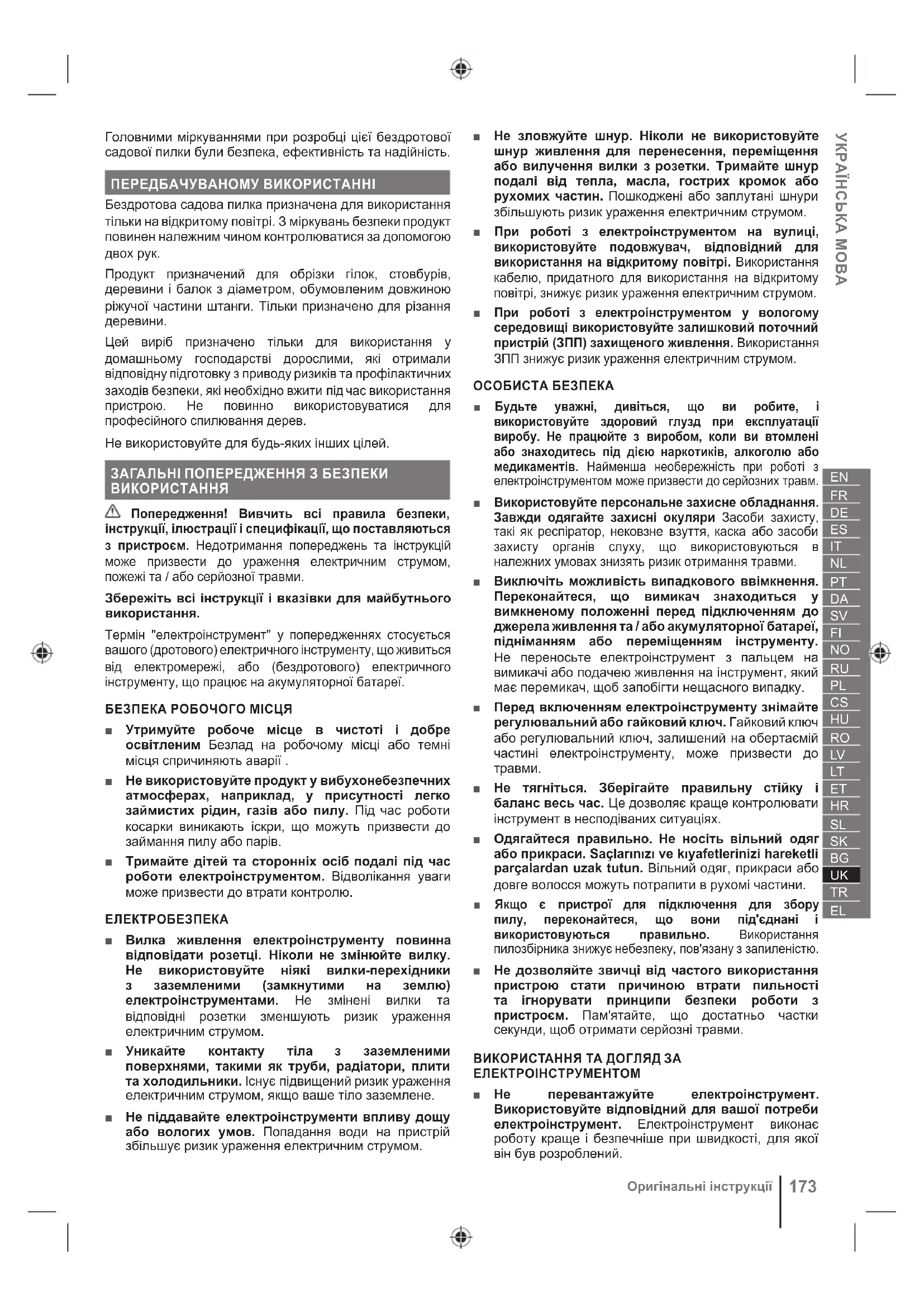 Цей виріб призначено тільки для використання у домашньому господарстві дорослими, які отримали відповідну підготовку з приводу ризиків та профілактичних заходів безпеки, які необхідно вжити під час використання пристрою. Не повинно використовуватися для професійного спилювання дерев. Не використовуйте для будь-яких інших цілей. ЗАГАЛЬНІ ПОПЕРЕДЖЕННЯ З БЕЗПЕКИ ВИКОРИСТАННЯ Попередження! Вивчить всі правила безпеки, інструкції, ілюстрації і специфікації, що поставляються з пристроєм. Недотримання попереджень та інструкцій може призвести до ураження електричним струмом, пожежі та / або серйозної травми. Збережіть всі інструкції і вказівки для майбутнього використання. Термін "електроінструмент" у попередженнях стосується вашого (дротового) електричного інструменту, що живиться від електромережі, або (бездротового) електричного інструменту, що працює на акумуляторної батареї. БЕЗПЕКА РОБОЧОГО МІСЦЯ ■ Утримуйте робоче місце в чистоті і добре освітленим Безлад на робочому місці або темні місця спричиняють аварії . ■ Не використовуйте продукт у вибухонебезпечних атмосферах, наприклад, у присутності легко займистих рідин, газів або пилу. Під час роботи косарки виникають іскри, що можуть призвести до займання пилу або парів. ■ Тримайте дітей та сторонніх осіб подалі під час роботи електроінструментом. Відволікання уваги може призвести до втрати контролю. ЕЛЕКТРОБЕЗПЕКА ■ Вилка живлення електроінструменту повинна відповідати розетці. Ніколи не змінюйте вилку. Не використовуйте ніякі вилки-перехідники з заземленими (замкнутими на землю) електроінструментами. Не змінені вилки та відповідні розетки зменшують ризик ураження електричним струмом. ■ Уникайте контакту тіла з заземленими поверхнями, такими як труби, радіатори, плити та холодильники. Існує підвищений ризик ураження електричним струмом, якщо ваше тіло заземлене. ■ Не піддавайте електроінструменти впливу дощу або вологих умов. Попадання води на пристрій збільшує ризик ураження електричним струмом. ■ Не зловжуйте шнур. Ніколи не використовуйте шнур живлення для перенесення, переміщення або вилучення вилки з розетки. Тримайте шнур подалі від тепла, масла, гострих кромок або рухомих частин. Пошкоджені або заплутані шнури збільшують ризик ураження електричним струмом. ■ При роботі з електроінструментом на вулиці, використовуйте подовжувач, відповідний для використання на відкритому повітрі. Використання кабелю, придатного для використання на відкритому повітрі, знижує ризик ураження електричним струмом. ■ При роботі з електроінструментом у вологому середовищі використовуйте залишковий поточний пристрій (ЗПП) захищеного живлення. Використання ЗПП знижує ризик ураження електричним струмом. ОСОБИСТА БЕЗПЕКА ■ Будьте уважні, дивіться, що ви робите, і використовуйте здоровий глузд при експлуатації виробу. Не працюйте з виробом, коли ви втомлені або знаходитесь під дією наркотиків, алкоголю або медикаментів. Найменша необережність при роботі з електроінструментом може призвести до серйозних травм. ■ Використовуйте персональне захисне обладнання. Завжди одягайте захисні окуляри Засоби захисту, такі як респіратор, нековзне взуття, каска або засоби захисту органів слуху, що використовуються в належних умовах знизять ризик отримання травми. ■ Виключ
