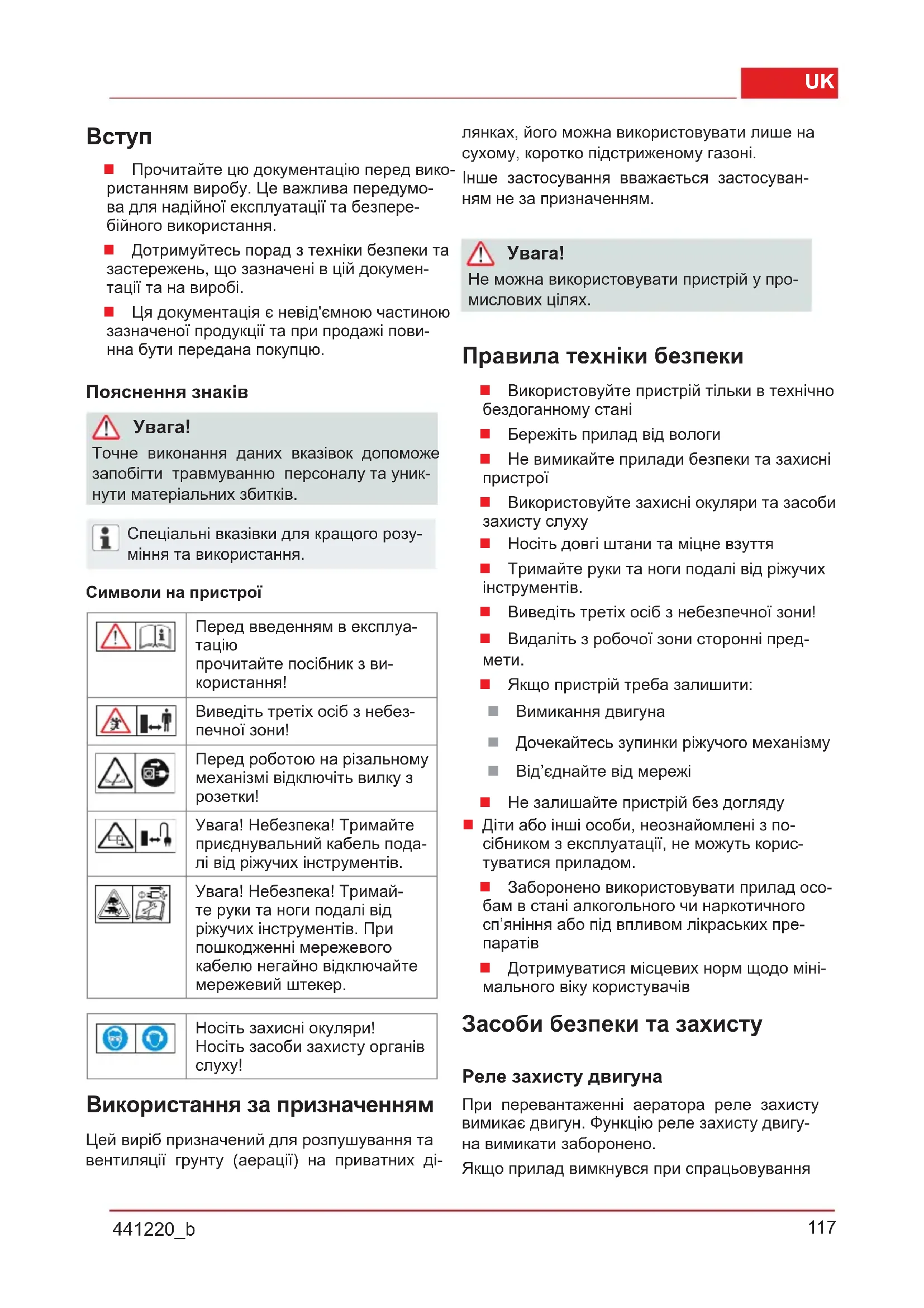 Дотримуватися місцевих норм щодо міні- мального віку користувачів Засоби безпеки та захисту Реле захисту двигуна При перевантаженні аератора реле захисту вимикає двигун. Функцію реле захисту двигу- на вимикати заборонено. Якщо прилад вимкнувся при спрацьовування118 Переклад оригінального посібника з експлуатації реле захисту двигуна, виконайте наступне: