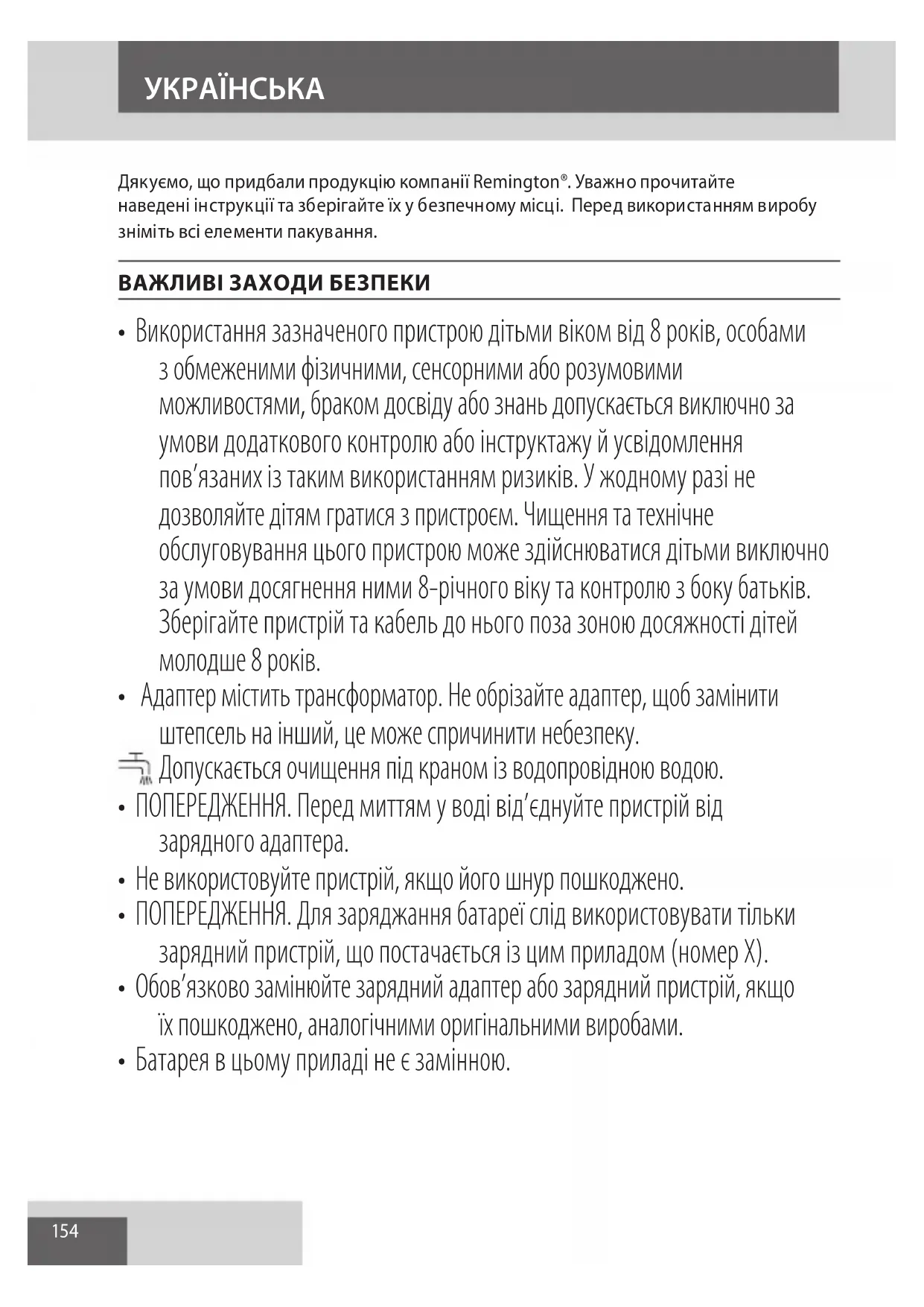 AE154 Дякуємо, що придбали продукцію компанії Remington®. Уважно прочитайте наведені інструкції та зберігайте їх у безпечному місці. Перед використанням виробу зніміть всі елементи пакування. ВАЖЛИВІ ЗАХОДИ БЕЗПЕКИ