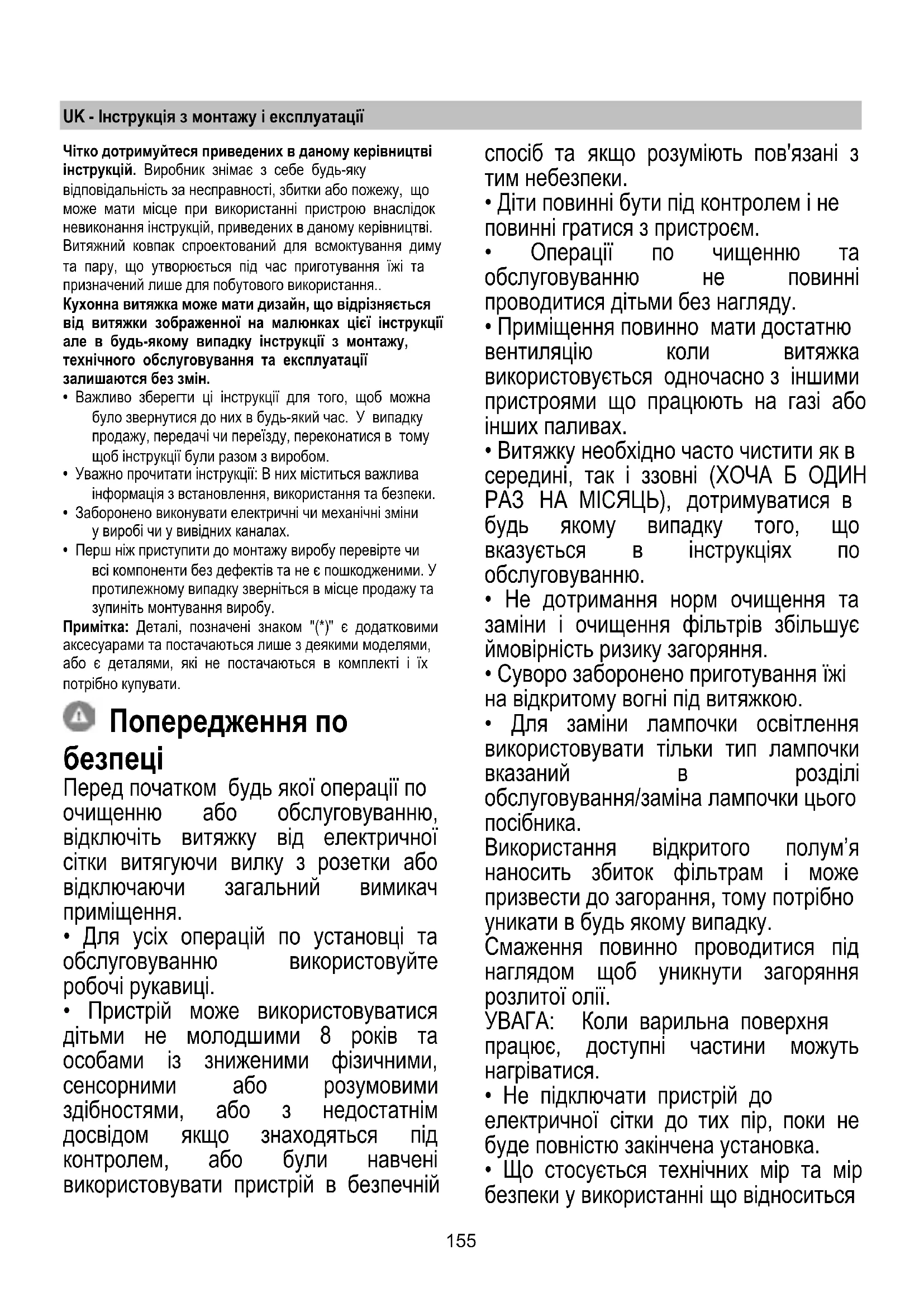 Замена ламп Вытяжка оборудована освещением на светодиодах LED. Светодиоды обеспечивают оптимальное освещение, их срок службы в 10 раз превышает срок работы традиционных лампочек, и позволяют экономить 90% электроэнергии. Для замены светодиодов обратитесь в авторизированный сервисный центр.155 UK - Інструкція з монтажу і експлуатації Чітко дотримуйтеся приведених в даному керівництві інструкцій. Виробник знімає з себе будь-яку відповідальність за несправності, збитки або пожежу, що може мати місце при використанні пристрою внаслідок невиконання інструкцій, приведених в даному керівництві. Витяжний ковпак спроектований для всмоктування диму та пару, що утворюється під час приготування їжі та призначений лише для побутового використання.. Кухонна витяжка може мати дизайн, що відрізняється від витяжки зображенної на малюнках цієї інструкції але в будь-якому випадку інструкції з монтажу, технічного обслуговування та експлуатації залишаются без змін.