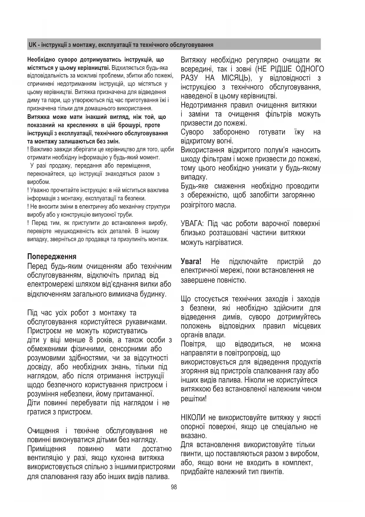! Уважно прочитайте інструкцію: в ній міститься важлива інформація з монтажу, експлуатації та безпеки. ! Не вносити зміни в електричну або механічну структури виробу або у конструкцію випускної труби. ! Перед тим, як приступити до встановлення виробу, перевірте неушкодженість всіх деталей. В іншому випадку, зверніться до продавця та призупиніть монтаж. Попередження Перед будь-яким очищенням або технічним обслуговуванням, відключіть прилад від електромережі шляхом від’єднання вилки або відключенням загального вимикача будинку. Під час усіх робот з монтажу та обслуговування користуйтеся рукавичками. Пристроєм не можуть користуватись діти у віці менше 8 років, а також особи з обмеженими фізичними, сенсорними або розумовими здібностями, чи за відсутності досвіду, або необхідних знань, тільки під наглядом, або після отримання інструкції щодо безпечного користування пристроєм і розуміння небезпеки, йому притаманної. Діти повинні перебувати під наглядом і не гратися з пристроєм. Очищення і технічне обслуговування не повинні виконуватися дітьми без нагляду. Приміщення повинно мати достатню вентиляцію у разі, якщо кухонна витяжка використовується спільно з іншими пристроями для спалювання газу або інших видів палива. Витяжку необхідно регулярно очищати як всередині, так і зовні (НЕ РІДШЕ ОДНОГО РАЗУ НА МІСЯЦЬ), у відповідності з інструкцією з технічного обслуговування, наведеної в цьому керівництві. Недотримання правил очищення витяжки і заміни та очищення фільтрів можуть призвести до пожежі. Суворо заборонено готувати їжу на відкритому вогні. Використання відкритого полум’я наносить шкоду фільтрам і може призвести до пожежі, тому цього необхідно уникати у будь-якому