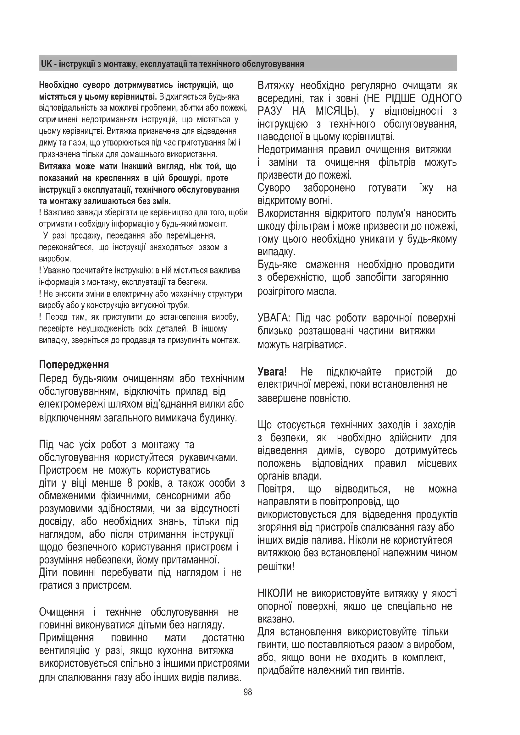 ! Уважно прочитайте інструкцію: в ній міститься важлива інформація з монтажу, експлуатації та безпеки. ! Не вносити зміни в електричну або механічну структури виробу або у конструкцію випускної труби. ! Перед тим, як приступити до встановлення виробу, перевірте неушкодженість всіх деталей. В іншому випадку, зверніться до продавця та призупиніть монтаж. Попередження Перед будь-яким очищенням або технічним обслуговуванням, відключіть прилад від електромережі шляхом від’єднання вилки або відключенням загального вимикача будинку. Під час усіх робот з монтажу та обслуговування користуйтеся рукавичками. Пристроєм не можуть користуватись діти у віці менше 8 років, а також особи з обмеженими фізичними, сенсорними або розумовими здібностями, чи за відсутності досвіду, або необхідних знань, тільки під наглядом, або після отримання інструкції щодо безпечного користування пристроєм і розуміння небезпеки, йому притаманної. Діти повинні перебувати під наглядом і не гратися з пристроєм. Очищення і технічне обслуговування не повинні виконуватися дітьми без нагляду. Приміщення повинно мати достатню вентиляцію у разі, якщо кухонна витяжка використовується спільно з іншими пристроями для спалювання газу або інших видів палива. Витяжку необхідно регулярно очищати як всередині, так і зовні (НЕ РІДШЕ ОДНОГО РАЗУ НА МІСЯЦЬ), у відповідності з інструкцією з технічного обслуговування, наведеної в цьому керівництві. Недотримання правил очищення витяжки і заміни та очищення фільтрів можуть призвести до пожежі. Суворо заборонено готувати їжу на відкритому вогні. Використання відкритого полум’я наносить шкоду фільтрам і може призвести до пожежі, тому цього необхідно уникати у будь-якому