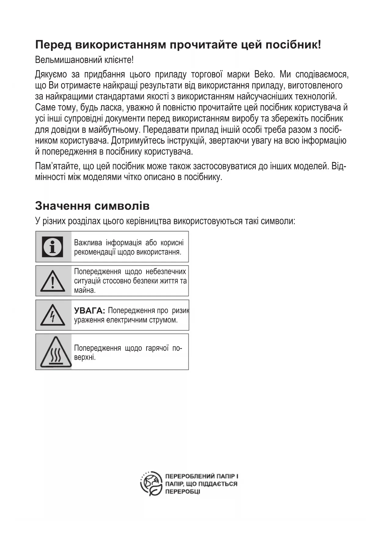 Попередження про ризик ураження електричним струмом. Попередження щодо гарячої по- верхні.Мікрохвильова піч / Посібник користувача 181 / UA 1 Важливі інструкції щодо техніки безпеки та охорони навколишнього середовища Уважно читайте та зберігайте для по- дальшого вико- ристання важливі інструкції з техніки