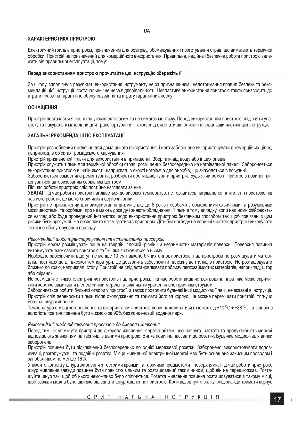 Пристрій постачається повністю укомплектованим та не вимагає монтажу. Перед використанням пристрою слід зняти упа- ковку та пакувальні матеріали для транспортування. Також слід виконати дії, описані в подальшій частині цієї інструкції. ЗАГАЛЬНІ РЕКОМЕНДАЦІЇ ПО ЕКСПЛУАТАЦІЇ Пристрій розроблений виключно для домашнього використання, і його заборонено використовувати в комерційних цілях, наприклад, в об’єктах громадського харчування. Пристрій призначений тільки для використання в приміщенні. Зберігати від дощу або інших опадів. Пристрій служить тільки для термічної обробки страв, розміщених безпосередньо на нагрівальної панелі. Забороняється використання пристрою в іншій якості, наприклад, в якості нагрівача для виробів, що знаходяться в посудині. Забороняється самостійно ремонтувати, розбирати або модифікувати пристрій. Будь-який ремонт пристрою повинен ви- конуватися авторизованим сервісним центром. Під час роботи пристрою слід постійно наглядати за ним. УВАГА! Під час роботи пристрій нагрівається до високих температур, не торкайтесь нагрівальної плити, стін пристрою під час його роботи, це може спричинити серйозні опіки. Пристрій не призначений для використання дітьми у віці до 8 років і особами з обмеженими фізичними та розумовими можливостями, та особами, про не мають досвіду і знають обладнання. Тільки в тому випадку, коли над ними здійснюєть- ся нагляд або буде проведений інструктаж щодо використання пристрою безпечним способом так, щоб пов’язані з цим ризики були зрозумілі. Не дозволяйте дітям гратися з приладом. Діти без нагляду не повинні чистити пристрій і виконувати технічне обслуговування приладу. Рекомендації щодо транспортування та встановлення пристрою Пристрій можна розміщувати лише на твердій, плоскій, рівній і з незаймистих матеріалів поверхні. Поверхня повинна витримувати вагу самого пристрою та їжі, яка знаходиться в ньому. Необхідно забезпечити відступ не менше 10 см навколо бічних стінок пристрою, над пристроєм не розміщувати матері- алів, нестійких до дії високої температури. Це дозволить забезпечити належну вентиляцію пристрою. Не розташовувати близько до краю, наприклад, столу. Пристрій не слід встановлювати поблизу легкозаймистих матеріалів, наприклад, штор або фіранок. Не розміщайте ніяких електричних пристроїв над пристроєм. Під час роботи виділяється водяна пара, яка може спричи- нити коротке замикання в електричній мережі та викликати ураження електричним струмом. Забороняється робити будь-які отвори у пристрої, а також проводити будь-які інші модифікації печі, не вказані в інструкції. Пристрій слід переносити тільки після охолодження та тримати його за корпус. Не можна переміщати пристрій, тягнучи його за шнур живлення. Температура в місці встановлення та використання пристрою повинна коливатися в межах від +10