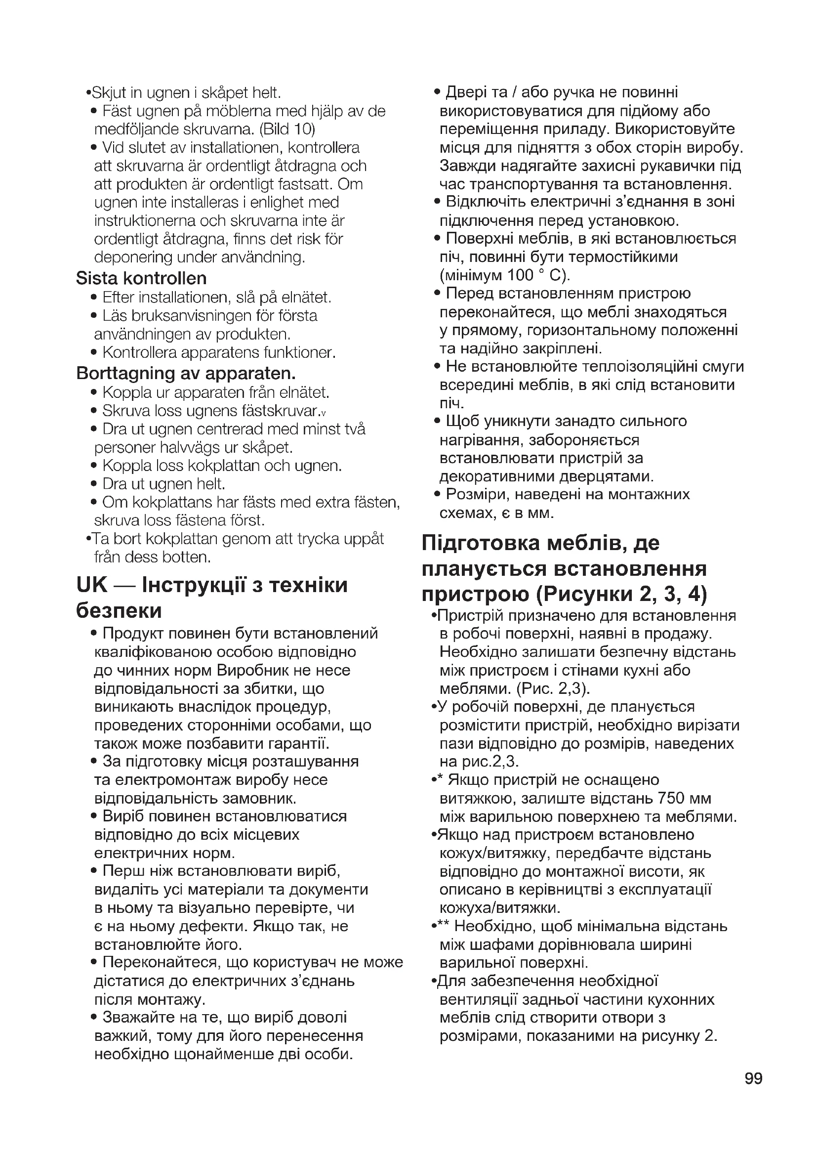 - В кінці монтажу переконайтесь, що гвинти правильно затягнуті та виріб надійно зафіксовано. Якщо духовку не встановлено відповідно до інструкцій, а гвинти не затягнуті належним чином, існує небезпека перекидання під час використання. Остаточна перевірка