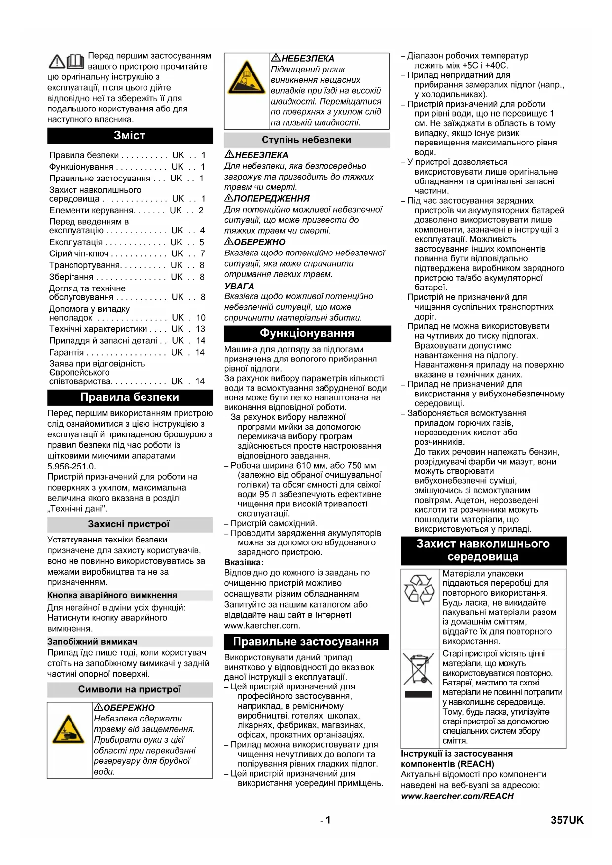 Chairman of the Board of Management Director Regulatory Affairs & Certification 356 LT- 1 Перед першим застосуванням вашого пристрою прочитайте цю оригінальну інструкцію з експлуатації, після цього дійте відповідно неї та збережіть її для подальшого користування або для наступного власника. Перед першим використанням пристрою слід ознайомитися з цією інструкцією з експлуатації й прикладеною брошурою з правил безпеки під час роботи із щітковими миючими апаратами 5.956-251.0. Пристрій призначений для роботи на поверхнях з ухилом, максимальна величина якого вказана в розділі „Технічні дані". Устаткування техніки безпеки призначене для захисту користувачів, воно не повинно використовуватись за межами виробництва та не за призначенням. Для негайної відміни усіх функцій: Натиснути кнопку аварийного