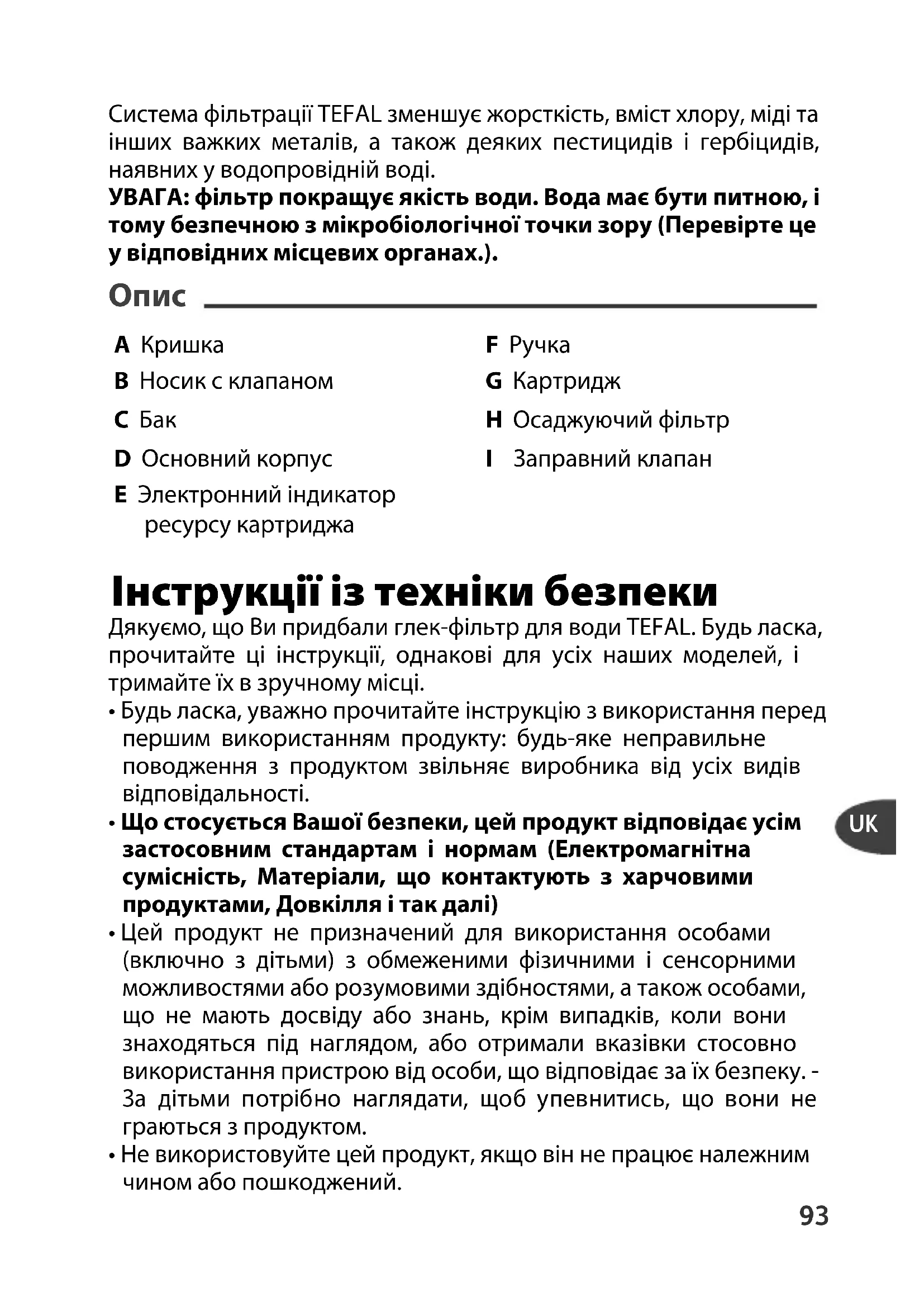 - Не використовуйте цей продукт, якщо він не працює належним чином або пошкоджений. A Кришка B Носик с клапаном C Бак D Основний корпус E Электронний індикатор ресурсу картриджа F Ручка G Картридж H Осаджуючий фільтр I Заправний клапан TE_CARAFE_NC00111257_Mise en page 1 04/06/12 09:08 Page9394 В цьому випадку, будь ласка, зв'яжіться з сервісним центром.