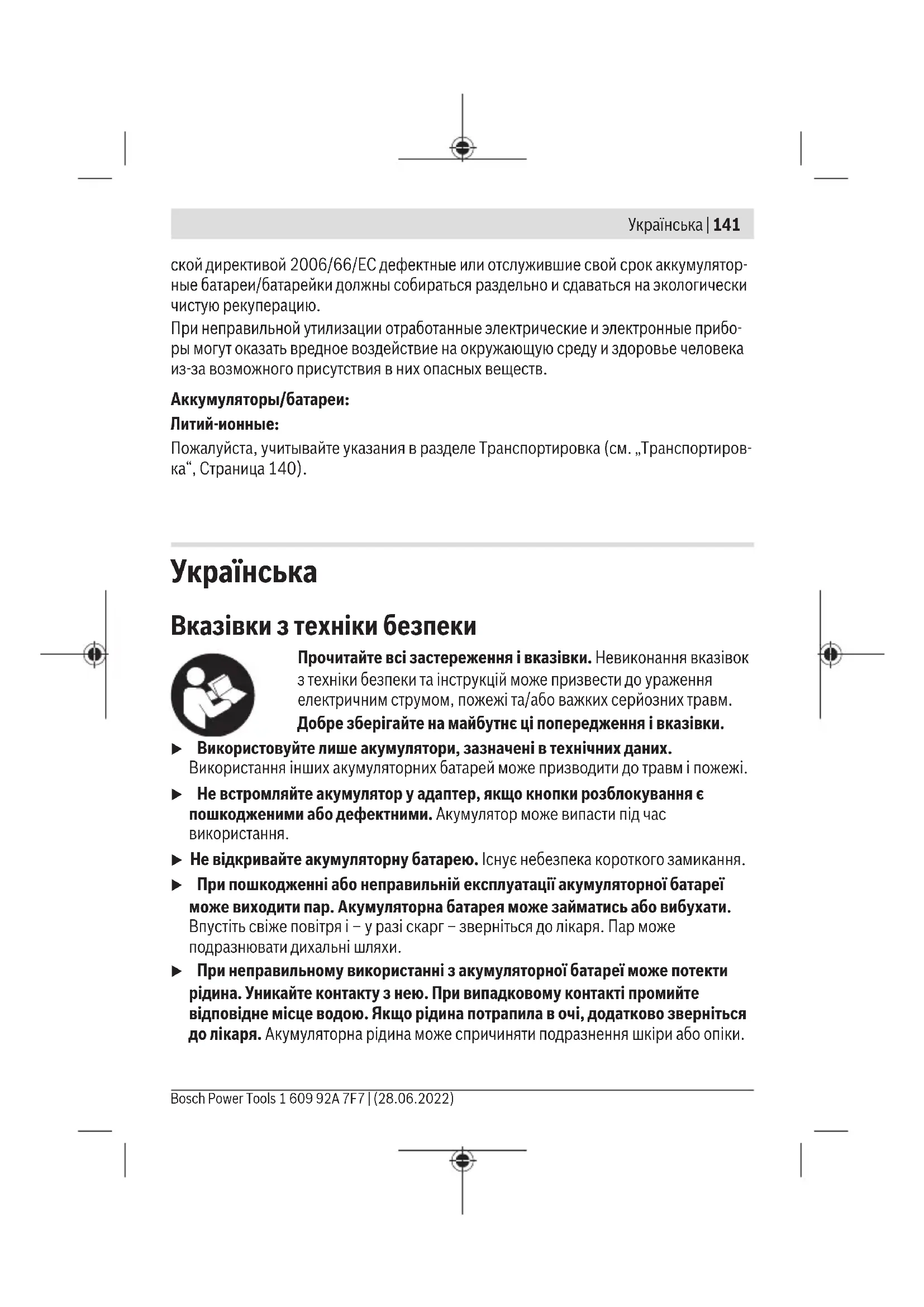 1 609 92A 7F7 | (28.06.2022) Bosch Power ToolsҚазақ | 149 При неправильній утилізації відпрацьовані електричні та електронні прилади можуть мати шкідливий вплив на навколишнє середовище та здоров’я людини через можливу наявність небезпечних речовин. Акумулятори/батарейки: Літієво-іонні: Будь ласка, враховуйте вказівки у розділі Транспортування (див. „Транспортування“, Сторінка148).