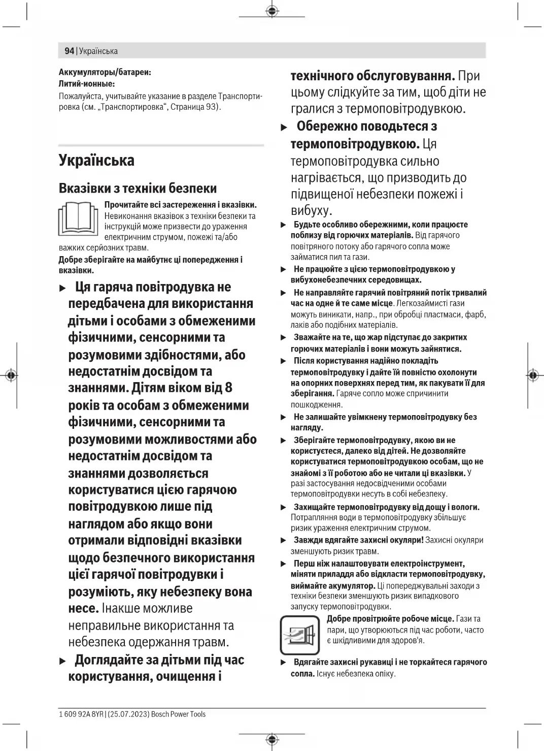 u Будьте особливо обережними, коли працюєте поблизу від горючих матеріалів. Від гарячого повітряного потоку або гарячого сопла може займатися пил та гази. u Не працюйте з цією термоповітродувкою у вибухонебезпечних середовищах. u Не направляйте гарячий повітряний потік тривалий час на одне й те саме місце. Легкозаймисті гази можуть виникати, напр., при обробці пластмаси, фарб, лаків або подібних матеріалів. u Зважайте на те, що жар підступає до закритих горючих матеріалів і вони можуть зайнятися. u Після користування надійно покладіть термоповітродувку і дайте їй повністю охолонути на опорних поверхнях перед тим, як пакувати її для зберігання. Гаряче сопло може спричинити пошкодження. u Не залишайте увімкнену термоповітродувку без u Зберігайте термоповітродувку, якою ви не користуєтеся, далеко від дітей. Не дозволяйте користуватися термоповітродувкою особам, що не знайомі з її роботою або не читали ці вказівки. У разі застосування недосвідченими особами термоповітродувки несуть в собі небезпеку. u Захищайте термоповітродувку від дощу і вологи. Потрапляння води в термоповітродувку збільшує ризик ураження електричним струмом. u Завжди вдягайте захисні окуляри! Захисні окуляри зменшують ризик травм. u Перш ніж налаштовувати електроінструмент, міняти приладдя або відкласти термоповітродувку, виймайте акумулятор. Ці попереджувальні заходи з техніки безпеки зменшують ризик випадкового запуску термоповітродувки. Добре провітрюйте робоче місце. Гази та пари, що утворюються під час роботи, часто є шкідливими для здоров'я. u Вдягайте захисні рукавиці і не торкайтеся гарячого сопла. Існує небезпека опіку. 1 609 92A 8YR | (25.07.2023) Bosch Power ToolsУкраїнська | 95 u Не направляйте гарячий потік повітря на людей або u Не використовуйте термоповітродувку в якості фена для волосся. Потік повітря, що виходить з приладу, значно гарячіший, ніж у фені. u Слідкуйте за тим, щоб в термоповітродувку не потрапляли сторонні предмети. u Відстань між соплом і оброблюваною деталлю залежить від оброблюваного матеріалу (метал, пластмаса тощо) і передбаченого виду обробки. Завжди спочатку виконуйте тест стосовно кількості повітря і температури. u Не відкривайте акумуляторну батарею. Існує небезпека короткого замикання. u При пошкодженні або неправильній експлуатації акумуляторної батареї може виходити пар. Акумуляторна батарея може займатись або вибухати. Впустіть свіже повітря і – у разі скарг – зверніться до лікаря. Пар може подразнювати дихальні шляхи. u При неправильному використанні з акумуляторної батареї може потекти рідина. Уникайте контакту з нею. При випадковому контакті промийте відповідне місце водою. Якщо рідина потрапила в очі, додатково зверніться до лікаря. Акумуляторна рідина може спричиняти подразнення шкіри або