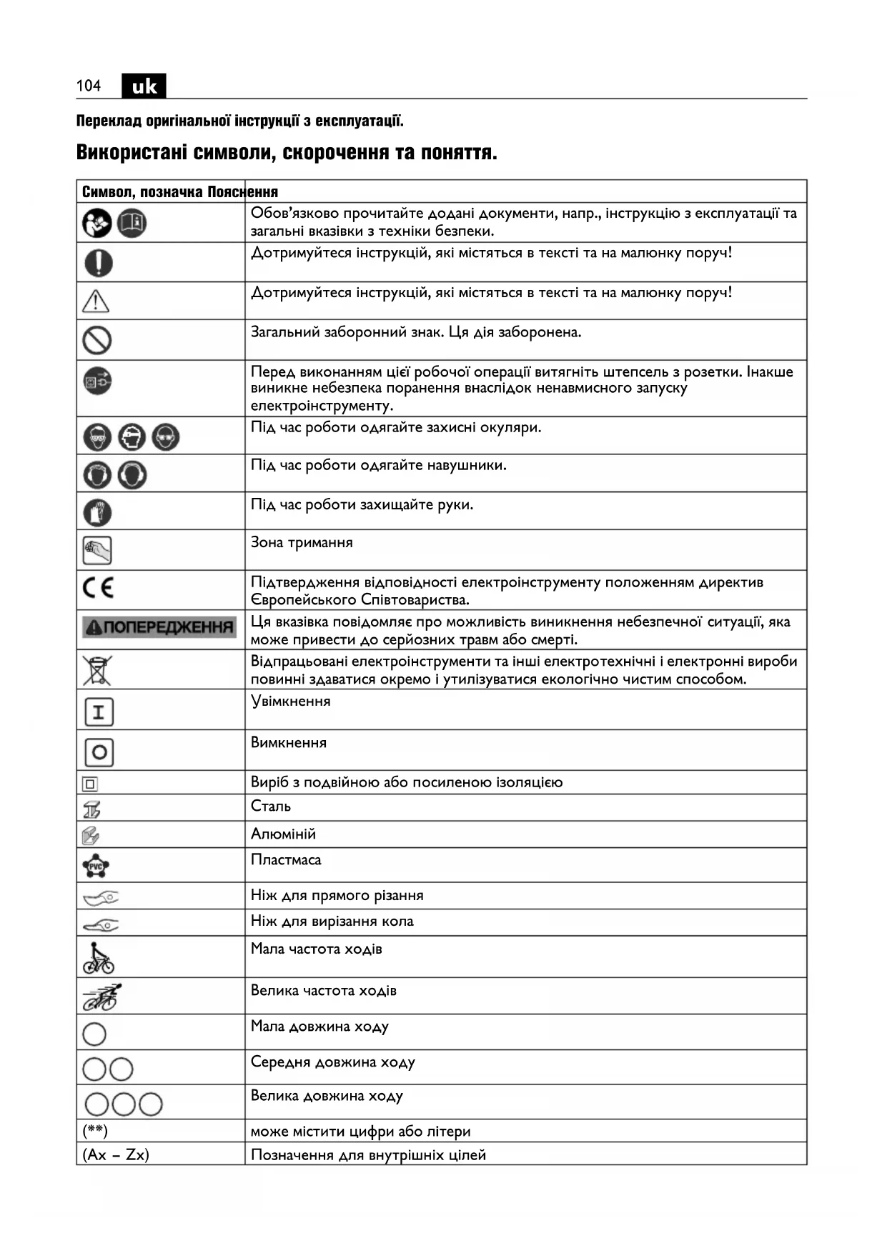 Переклад оригінальної інструкції з експлуатації. Використані символи, скорочення та поняття. Символ, позначка Пояснення Обов’язково прочитайте додані документи, напр., інструкцію з експлуатації та загальні вказівки з техніки безпеки. Дотримуйтеся інструкцій, які містяться в тексті та на малюнку поруч! Дотримуйтеся інструкцій, які містяться в тексті та на малюнку поруч! Загальний заборонний знак. Ця дія заборонена. Перед виконанням цієї робочої операції витягніть штепсель з розетки. Інакше виникне небезпека поранення внаслідок ненавмисного запуску електроінструменту. Під час роботи одягайте захисні окуляри. Під час роботи одягайте навушники. Під час роботи захищайте руки. Зона тримання Підтвердження відповідності електроінструменту положенням директив Європейського Співтовариства. Ця вказівка повідомляє про можливість виникнення небезпечної ситуації, яка може привести до серйозних травм або смерті. Відпрацьовані електроінструменти та інші електротехнічні і електронні вироби повинні здаватися окремо і утилізуватися екологічно чистим способом.