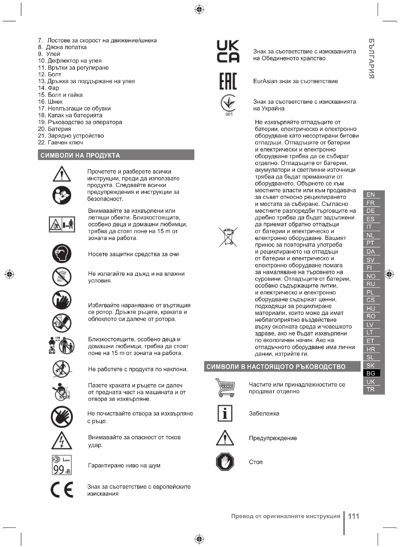Гарантований рівень звукової потужності. Європейський знак відповідності Британський знак відповідності Євразійська знак відповідності. Український знак відповідності Не викидайте старі акумулятори, старе електричне та електронне устаткування разом із несортованим побутовим сміттям. Старі акумулятори, старе електричне та електронне устаткування збираються окремо. З устаткування необхідно зняти старі батареї, акумулятори та джерела світла. За консультацією по утилізації пристрою слід звернутися до органу місцевої влади або до дилеру. Місцеве законодавство може зобов