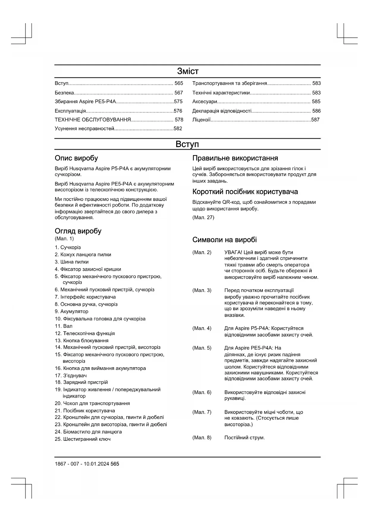 Опис виробу Виріб Husqvarna Aspire P5-P4A є акумуляторним сучкорізом. Виріб Husqvarna Aspire PE5-P4A є акумуляторним висоторізом із телескопічною конструкцією. Ми постійно працюємо над підвищенням вашої безпеки й ефективності роботи. По додаткову інформацію звертайтеся до свого дилера з обслуговування. Правильне використання Цей виріб використовується для зрізання гілок і сучків. Забороняється використовувати продукт для інших завдань. Короткий посібник користувача Відскануйте QR-код, щоб ознайомитися з порадами щодо використання виробу. (Мал. 27) Огляд виробу (Мал. 1)