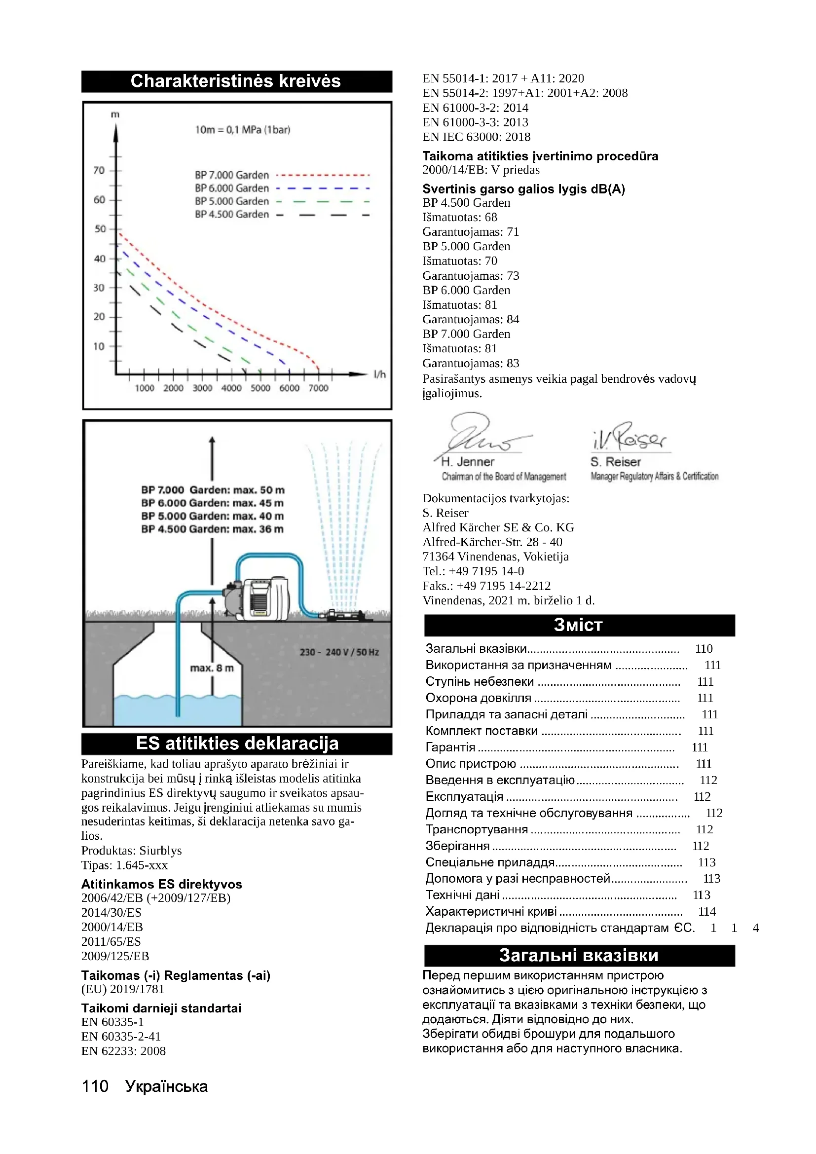 Причина виключення відповідно до Регламенту (ЄС) 2019/1781 Додаток I Розділ 2 (12): j) Можливі зміни у конструкції пристрою! Характеристичні криві Декларація про відповідність стандартам ЄС Цим ми повідомляємо, що нижче зазначена машина на основі своєї конструкції та конструктивного виконання, а також у випущеної у продаж моделі, відповідає спеціальним основним вимогам щодо безпеки та захисту здоров'я представлених нижче директив ЄС. У разі внесення неузгоджених із нами змін до машини ця заява втрачає свою чинність. Виріб: Насос Тип: 1.645-xxx Відповідні директиви ЄС 2006/42/EG (+2009/127/EG) 2014/30/ЄС 2000/14/ЄС 2011/65/ЄС 2009/125/ЄС Застосований(-і) регламент(-и) (ЄС) 2019/1781 Застосовувані гармонізовані стандарти EN 60335-1 EN 60335-2-41 EN 62233: 2008 EN 55014-1: 2017 + A11: 2020 EN 55014-2: 1997+A1: 2001+A2: 2008 EN 61000-3-2: 2014 EN 61000-3-3: 2013 EN IEC 63000: 2018 Застосовуваний метод оцінки відповідності 2000/14/ЄС: Додаток V Рівень звукової потужності, дБ(A) BP 4.500 Garden Виміряний: 68 Гарантований: 71 BP 5.000 Garden Виміряний: 70 Гарантований: 73 BP 6.000 Garden Виміряний: 81 Гарантований: 84 BP 7.000 Garden Виміряний: 81 Гарантований: 83 Особи, що нижче підписалися, діють від імені та за довіреністю керівництва.