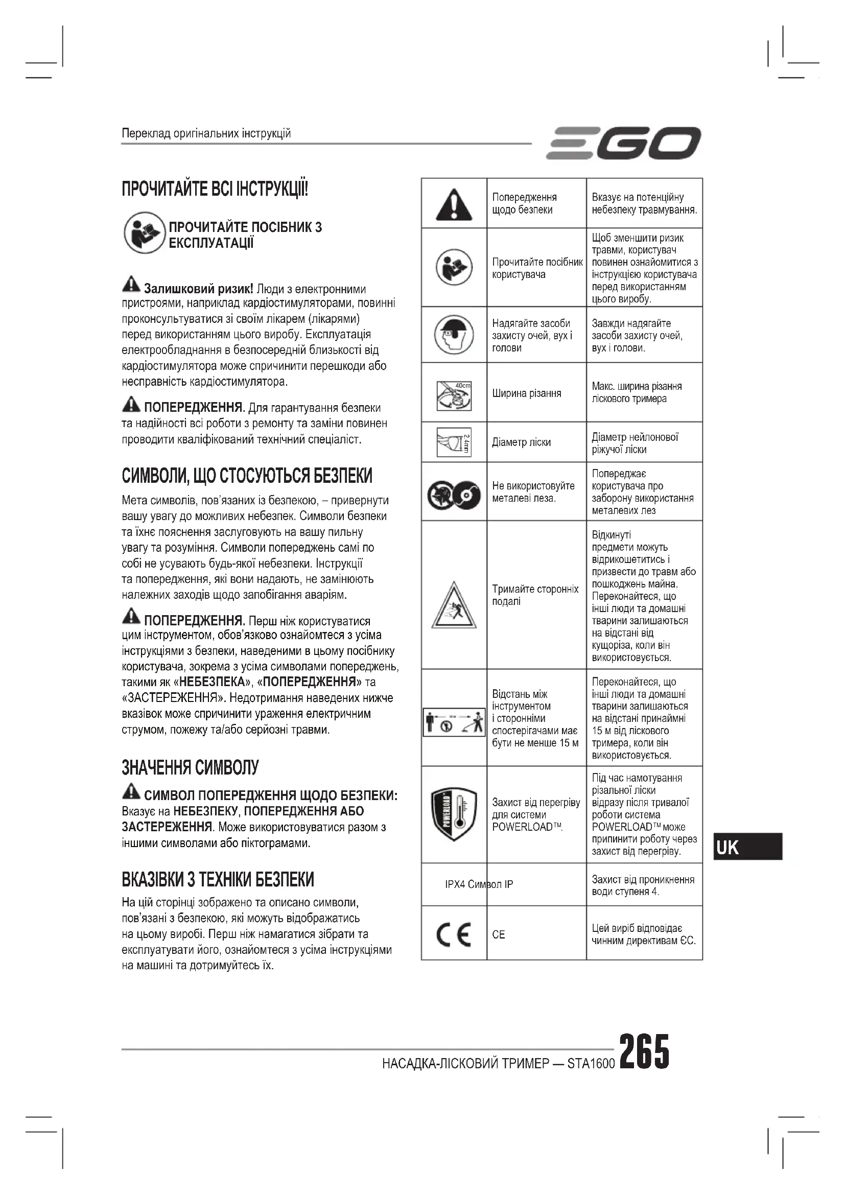 ПРОЧИТАЙТЕ ВСІ ІНСТРУКЦІЇ! ПРОЧИТАЙТЕ ПОСІБНИК З ЕКСПЛУАТАЦІЇ Залишковий ризик! Люди з електронними пристроями, наприклад кардіостимуляторами, повинні проконсультуватися зі своїм лікарем (лікарями) перед використанням цього виробу. Експлуатація електрообладнання в безпосередній близькості від кардіостимулятора може спричинити перешкоди або несправність кардіостимулятора. ПОПЕРЕДЖЕННЯ. Для гарантування безпеки та надійності всі роботи з ремонту та заміни повинен проводити кваліфікований технічний спеціаліст. СИМВОЛИ, ЩО СТОСУЮТЬСЯ БЕЗПЕКИ Мета символів, пов’язаних із безпекою, – привернути вашу увагу до можливих небезпек. Символи безпеки та їхнє пояснення заслуговують на вашу пильну увагу та розуміння. Символи попереджень самі по собі не усувають будь-якої небезпеки. Інструкції та попередження, які вони надають, не замінюють належних заходів щодо запобігання аваріям. ПОПЕРЕДЖЕННЯ. Перш ніж користуватися цим інструментом, обов’язково ознайомтеся з усіма інструкціями з безпеки, наведеними в цьому посібнику користувача, зокрема з усіма символами попереджень, такими як «НЕБЕЗПЕКА», «ПОПЕРЕДЖЕННЯ» та «ЗАСТЕРЕЖЕННЯ». Недотримання наведених нижче вказівок може спричинити ураження електричним струмом, пожежу та/або серйозні травми. ЗНАЧЕННЯ СИМВОЛУ СИМВОЛ ПОПЕРЕДЖЕННЯ ЩОДО БЕЗПЕКИ: Вказує на НЕБЕЗПЕКУ, ПОПЕРЕДЖЕННЯ АБО ЗАСТЕРЕЖЕННЯ. Може використовуватися разом з іншими символами або піктограмами. ВКАЗІВКИ З ТЕХНІКИ БЕЗПЕКИ На цій сторінці зображено та описано символи, пов’язані з безпекою, які можуть відображатись на цьому виробі. Перш ніж намагатися зібрати та експлуатувати його, ознайомтеся з усіма інструкціями на машині та дотримуйтесь їх.Попередження щодо безпекиВказує на потенційну небезпеку травмування.Прочитайте посібник користувачаЩоб зменшити ризик травми, користувач повинен ознайомитися з інструкцією користувача перед використанням цього виробу.Надягайте засоби захисту очей, вух і головиЗавжди надягайте засоби захисту очей, вух і голови. 40cm Ширина різанняМакс. ширина різання ліскового тримера 2.4mmДіаметр ліскиДіаметр нейлонової ріжучої ліскиНе використовуйте металеві леза.Попереджає користувача про заборону використання металевих лез Тримайте сторонніх подаліВідкинуті предмети можуть відрикошетитись і призвести до травм або пошкоджень майна. Переконайтеся, що інші люди та домашні тварини залишаються на відстані від кущоріза, коли він використовується.Відстань між інструментом і сторонніми спостерігачами має бути не менше 15 мПереконайтеся, що інші люди та домашні тварини залишаються на відстані принаймні 15 м від ліскового тримера, коли він використовується.Захист від перегріву для системи POWERLOAD