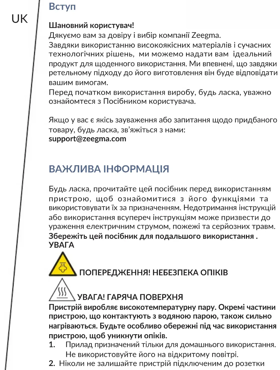 Шановний користувач! Дякуємо вам за довіру і вибір компанії Zeegma. Завдяки використанню високоякісних матеріалів і сучасних технологічних рішень, ми можемо надати вам ідеальний продукт для щоденного використання. Ми впевнені, що завдяки ретельному підходу до його виготовлення він буде відповідати вашим вимогам. Перед початком використання виробу, будь ласка, уважно ознайомтеся з Посібником користувача. Якщо у вас є якісь зауваження або запитання щодо придбаного товару, будь ласка, зв’яжіться з нами: support@zeegma.com ВАЖЛИВА ІНФОРМАЦІЯ Будь ласка, прочитайте цей посібник перед використанням пристрою, щоб ознайомитися з його функціями та використовувати їх за призначенням. Недотримання інструкцій або використання всупереч інструкціям може призвести до ураження електричним струмом, пожежі та серйозних травм. Збережіть цей посібник для подальшого використання .