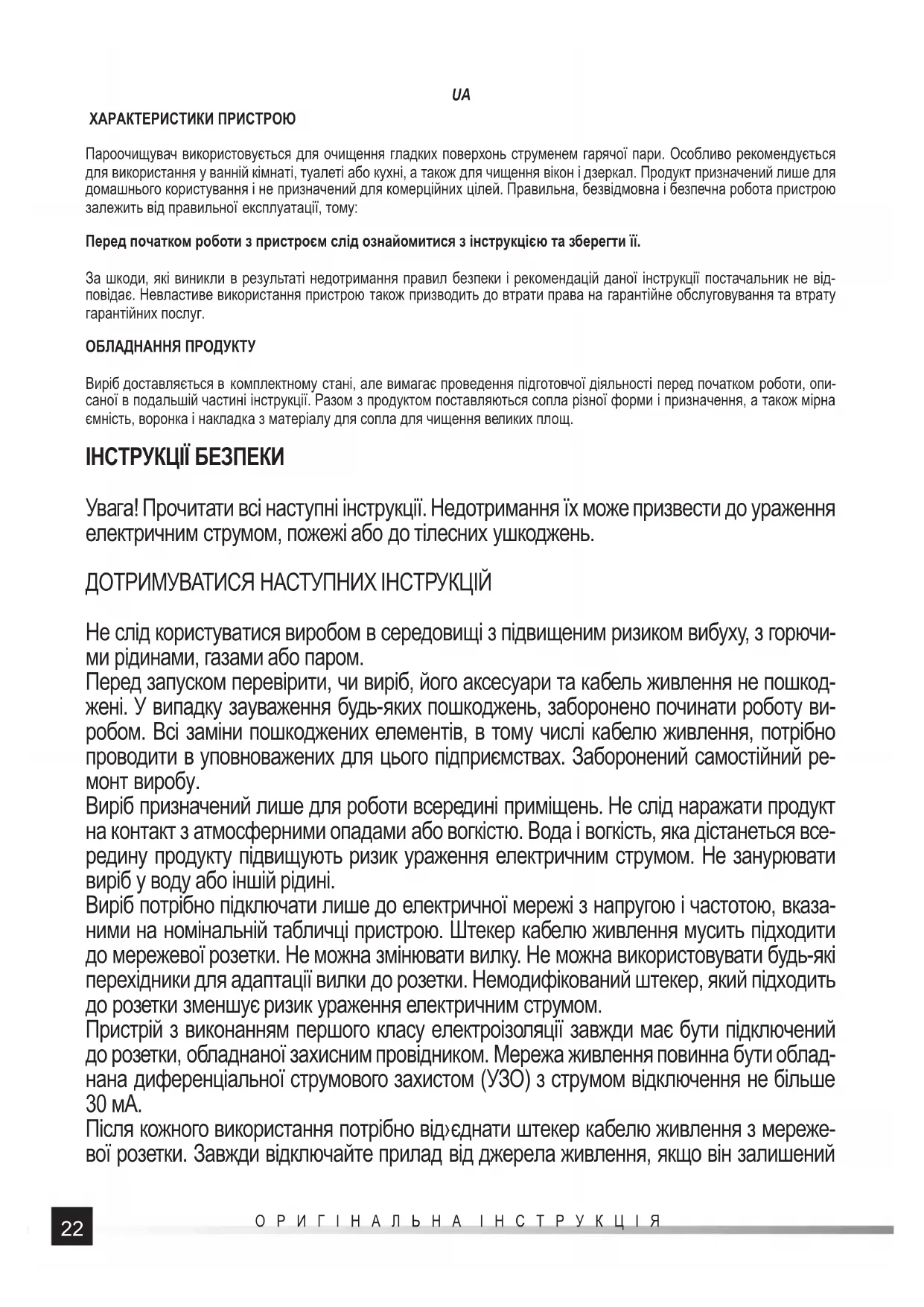 ХАРАКТЕРИСТИКИ ПРИСТРОЮ Пароочищувач використовується для очищення гладких поверхонь струменем гарячої пари. Особливо рекомендується для використання у ванній кімнаті, туалеті або кухні, а також для чищення вікон і дзеркал. Продукт призначений лише для домашнього користування і не призначений для комерційних цілей. Правильна, безвідмовна і безпечна робота пристрою залежить від правильної експлуатації, тому: Перед початком роботи з пристроєм слід ознайомитися з інструкцією та зберегти її. За шкоди, які виникли в результаті недотримання правил безпеки і рекомендацій даної інструкції постачальник не від- повідає. Невластиве використання пристрою також призводить до втрати права на гарантійне обслуговування та втрату гарантійних послуг. ОБЛАДНАННЯ ПРОДУКТУ Виріб доставляється в комплектному стані, але вимагає проведення підготовчої діяльності перед початком роботи, опи- саної в подальшій частині інструкції. Разом з продуктом поставляються сопла різної форми і призначення, а також мірна ємність, воронка і накладка з матеріалу для сопла для чищення великих площ. ІНСТРУКЦІЇ БЕЗПЕКИ Увага! Прочитати всі наступні інструкції. Недотримання їх може призвести до ураження електричним струмом, пожежі або до тілесних ушкоджень. ДОТРИМУВАТИСЯ НАСТУПНИХ ІНСТРУКЦІЙ Не слід користуватися виробом в середовищі з підвищеним ризиком вибуху, з горючи- ми рідинами, газами або паром. Перед запуском перевірити, чи виріб, його аксесуари та кабель живлення не пошкод- жені. У випадку зауваження будь-яких пошкоджень, заборонено починати роботу ви- робом. Всі заміни пошкоджених елементів, в тому числі кабелю живлення, потрібно проводити в уповноважених для цього підприємствах. Заборонений самостійний ре- монт виробу. Виріб призначений лише для роботи всередині приміщень. Не слід наражати продукт на контакт з атмосферними опадами або вогкістю. Вода і вогкість, яка дістанеться все- редину продукту підвищують ризик ураження електричним струмом. Не занурювати виріб у воду або іншій рідині. Виріб потрібно підключати лише до електричної мережі з напругою і частотою, вказа- ними на номінальній табличці пристрою. Штекер кабелю живлення мусить підходити до мережевої розетки. Не можна змінювати вилку. Не можна використовувати будь-які перехідники для адаптації вилки до розетки. Немодифікований штекер, який підходить до розетки зменшує ризик ураження електричним струмом. Пристрій з виконанням першого класу електроізоляції завжди має бути підключений до розетки, обладнаної захисним провідником. Мережа живлення повинна бути облад- нана диференціальної струмового захистом (УЗО) з струмом відключення не більше 30 мА. Після кожного використання потрібно від›єднати штекер кабелю живлення з мереже- вої розетки. Завжди відключайте прилад від джерела живлення, якщо він залишений23 ОРИГІНАЛЬНА ІНСТРУКЦІЯ