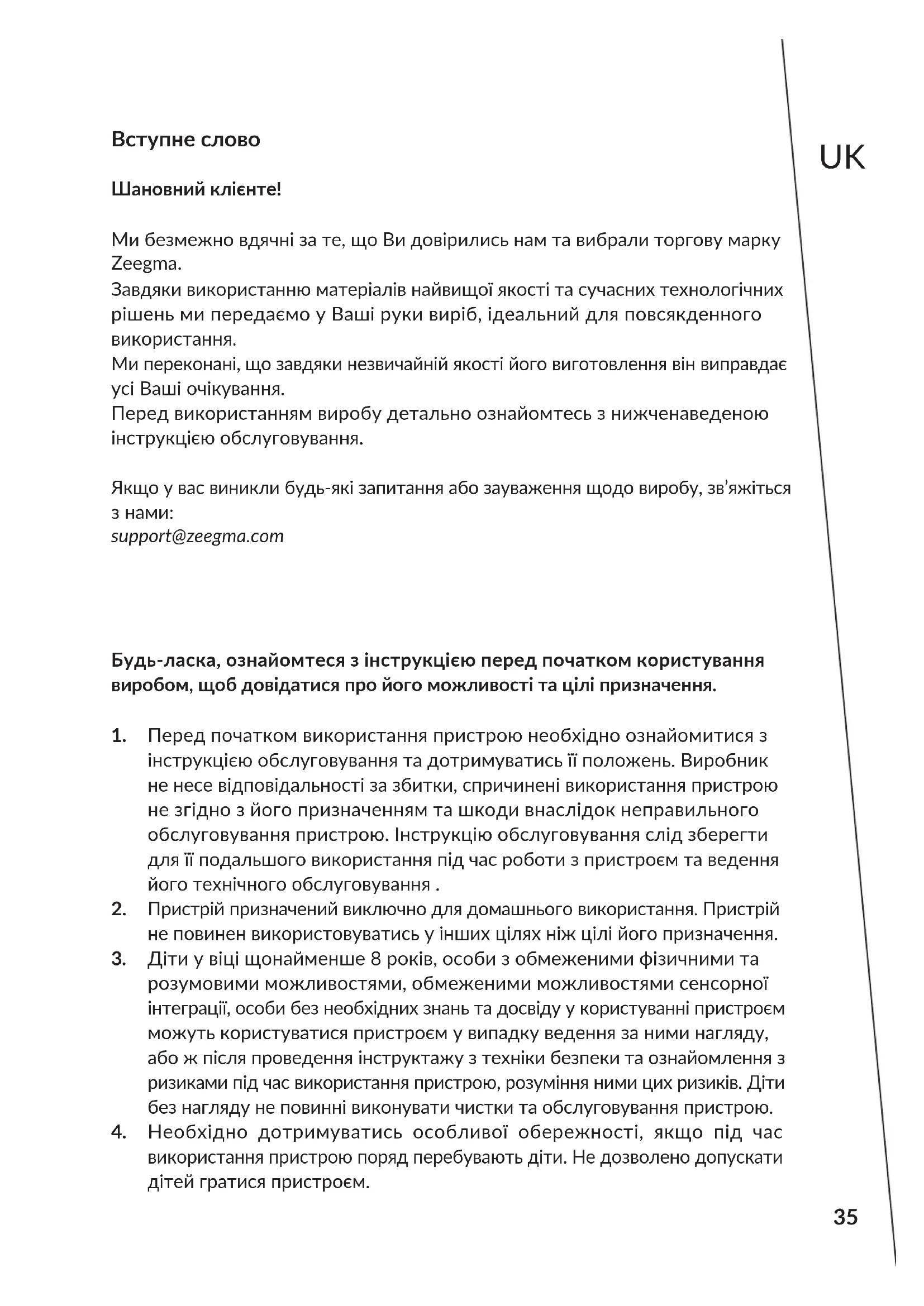 support@zeegma.com Важлива інформація Будь-ласка, ознайомтеся з інструкцією перед початком користування виробом, щоб довідатися про його можливості та цілі призначення.