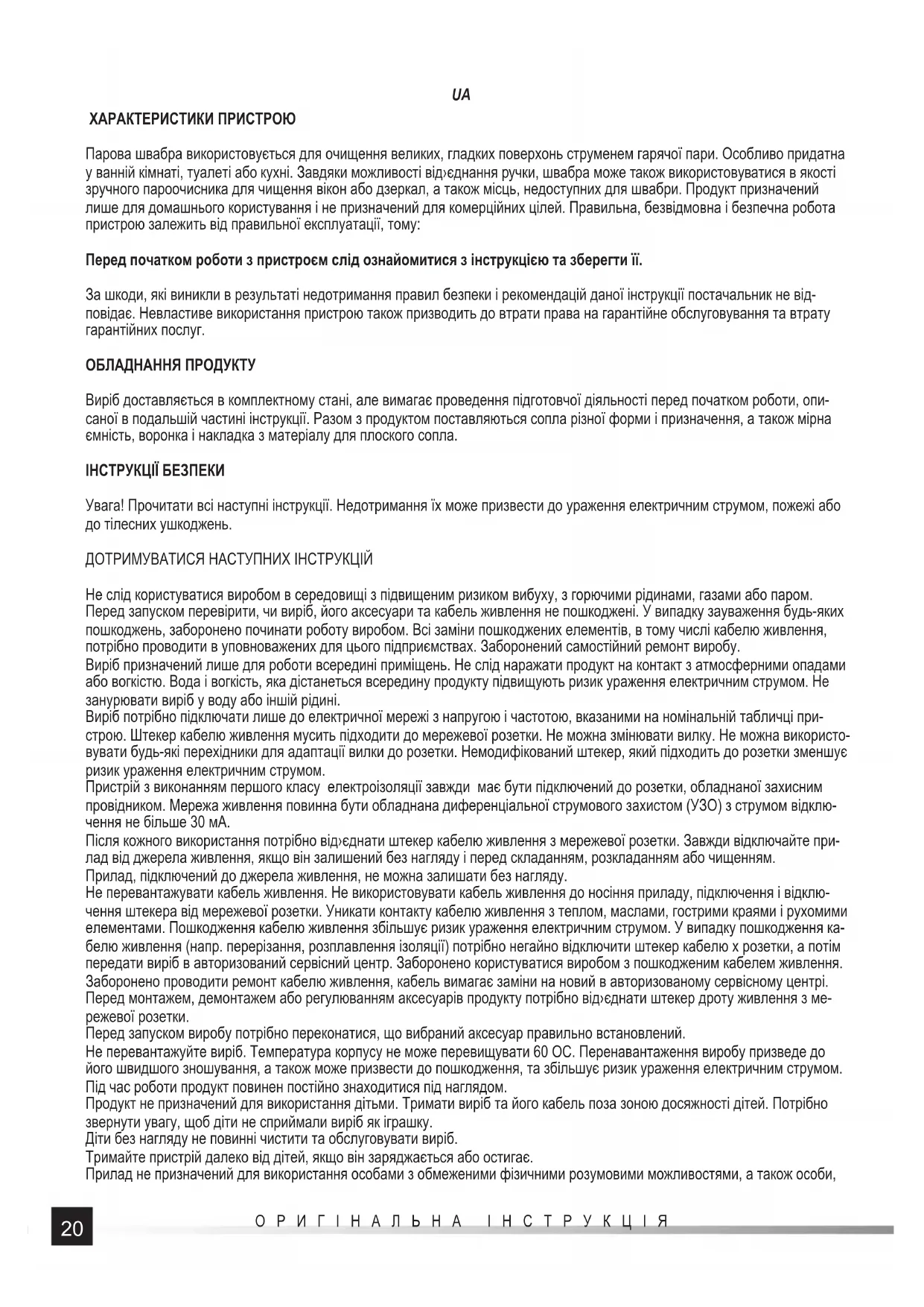 ХАРАКТЕРИСТИКИ ПРИСТРОЮ Парова швабра використовується для очищення великих, гладких поверхонь струменем гарячої пари. Особливо придатна у ванній кімнаті, туалеті або кухні. Завдяки можливості від›єднання ручки, швабра може також використовуватися в якості зручного пароочисника для чищення вікон або дзеркал, а також місць, недоступних для швабри. Продукт призначений лише для домашнього користування і не призначений для комерційних цілей. Правильна, безвідмовна і безпечна робота пристрою залежить від правильної експлуатації, тому: Перед початком роботи з пристроєм слід ознайомитися з інструкцією та зберегти її. За шкоди, які виникли в результаті недотримання правил безпеки і рекомендацій даної інструкції постачальник не від- повідає. Невластиве використання пристрою також призводить до втрати права на гарантійне обслуговування та втрату гарантійних послуг. ОБЛАДНАННЯ ПРОДУКТУ Виріб доставляється в комплектному стані, але вимагає проведення підготовчої діяльності перед початком роботи, опи- саної в подальшій частині інструкції. Разом з продуктом поставляються сопла різної форми і призначення, а також мірна ємність, воронка і накладка з матеріалу для плоского сопла. ІНСТРУКЦІЇ БЕЗПЕКИ Увага! Прочитати всі наступні інструкції. Недотримання їх може призвести до ураження електричним струмом, пожежі або до тілесних ушкоджень. ДОТРИМУВАТИСЯ НАСТУПНИХ ІНСТРУКЦІЙ Не слід користуватися виробом в середовищі з підвищеним ризиком вибуху, з горючими рідинами, газами або паром. Перед запуском перевірити, чи виріб, його аксесуари та кабель живлення не пошкоджені. У випадку зауваження будь-яких пошкоджень, заборонено починати роботу виробом. Всі заміни пошкоджених елементів, в тому числі кабелю живлення, потрібно проводити в уповноважених для цього підприємствах. Заборонений самостійний ремонт виробу. Виріб призначений лише для роботи всередині приміщень. Не слід наражати продукт на контакт з атмосферними опадами або вогкістю. Вода і вогкість, яка дістанеться всередину продукту підвищують ризик ураження електричним струмом. Не занурювати виріб у воду або іншій рідині. Виріб потрібно підключати лише до електричної мережі з напругою і частотою, вказаними на номінальній табличці при- строю. Штекер кабелю живлення мусить підходити до мережевої розетки. Не можна змінювати вилку. Не можна використо- вувати будь-які перехідники для адаптації вилки до розетки. Немодифікований штекер, який підходить до розетки зменшує ризик ураження електричним струмом. Пристрій з виконанням першого класу електроізоляції завжди має бути підключений до розетки, обладнаної захисним провідником. Мережа живлення повинна бути обладнана диференціальної струмового захистом (УЗО) з струмом відклю- чення не більше 30 мА. Після кожного використання потрібно від›єднати штекер кабелю живлення з мережевої розетки. Завжди відключайте при- лад від джерела живлення, якщо він залишений без нагляду і перед складанням, розкладанням або чищенням. Прилад, підключений до джерела живлення, не можна залишати без нагляду. Не перевантажувати кабель живлення. Не використовувати кабель живлення до носіння приладу, підключення і відклю- чення штекера від мережевої розетки. Уникати контакту кабелю живлення з теплом, маслами, гострими краями і рухомими елементами. 