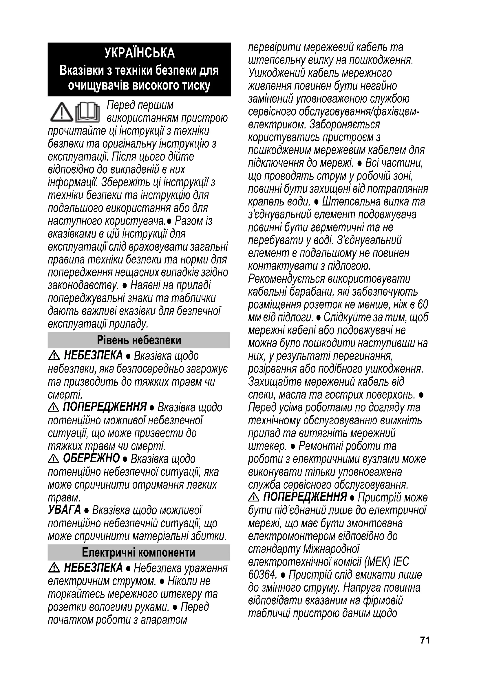 Вказівки з техніки безпеки для очищувачів високого тиску Рівень небезпеки Електричні компоненти72 напруги. ● Клас безпеки І - пристрої повинні бути підключені до джерел струму, заземлених належним чином. ● З міркувань безпеки радимо підключати пристрій через автомат захисту від струму витікання (макс. 30 мА). ● Непридатні електричні подовжувачі можуть бути небезпечними. На відкритому повітрі можна використати тільки придатний для використання і відповідним чином маркований електричний подовжувач з достатнім поперечним перерізом дроту. 1 - 10 м:1,5мм