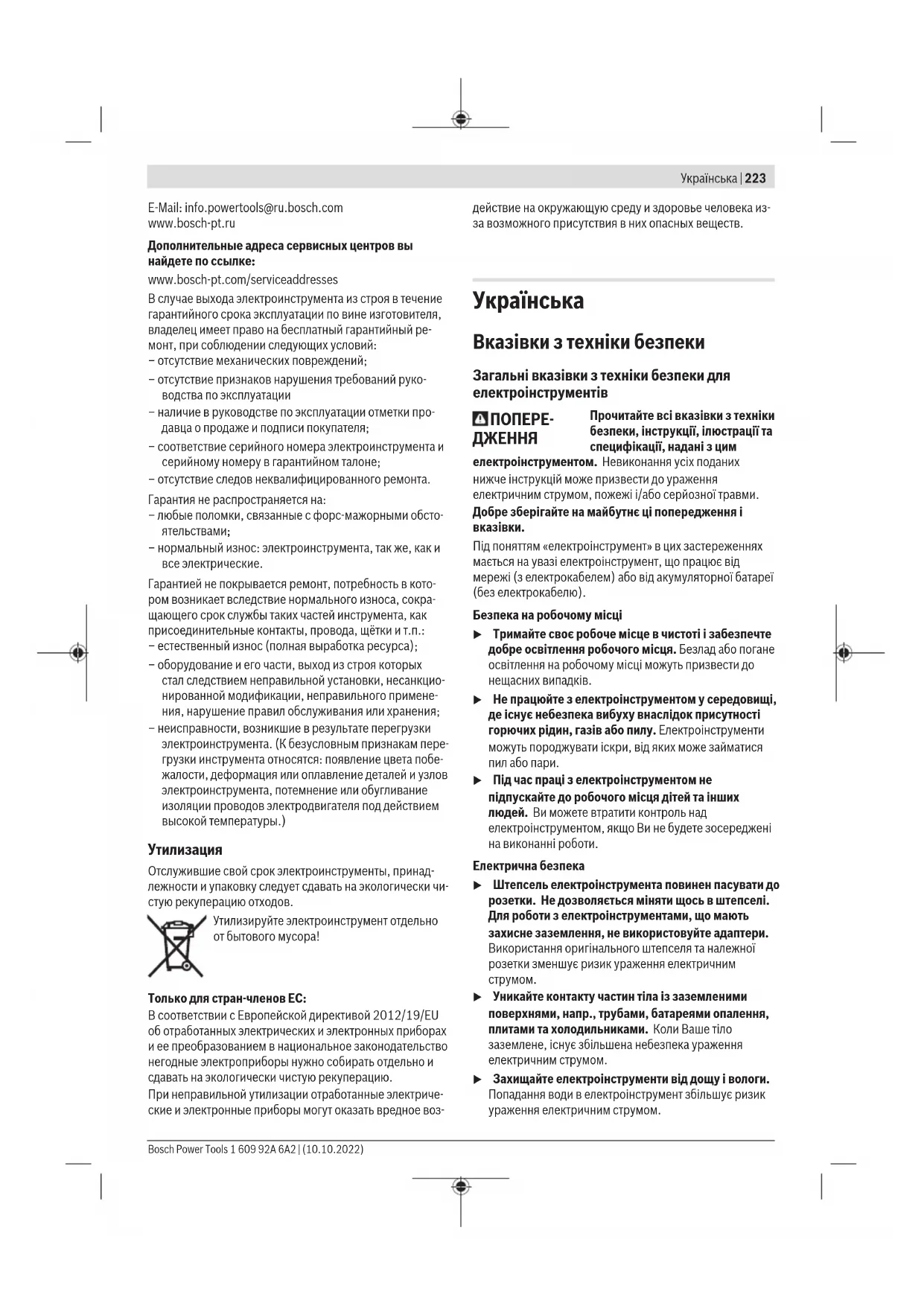 1 609 92A 6A2 | (10.10.2022) Bosch Power ToolsУкраїнська | 225 u Тримайте рукоятки і поверхні захвату сухими і чистими, слідкуйте, щоб на них не було оливи або густого мастила. Слизькі рукоятки і поверхні захвату унеможливлюють безпечне поводження з електроінструментом та його контролювання в неочікуваних ситуаціях.