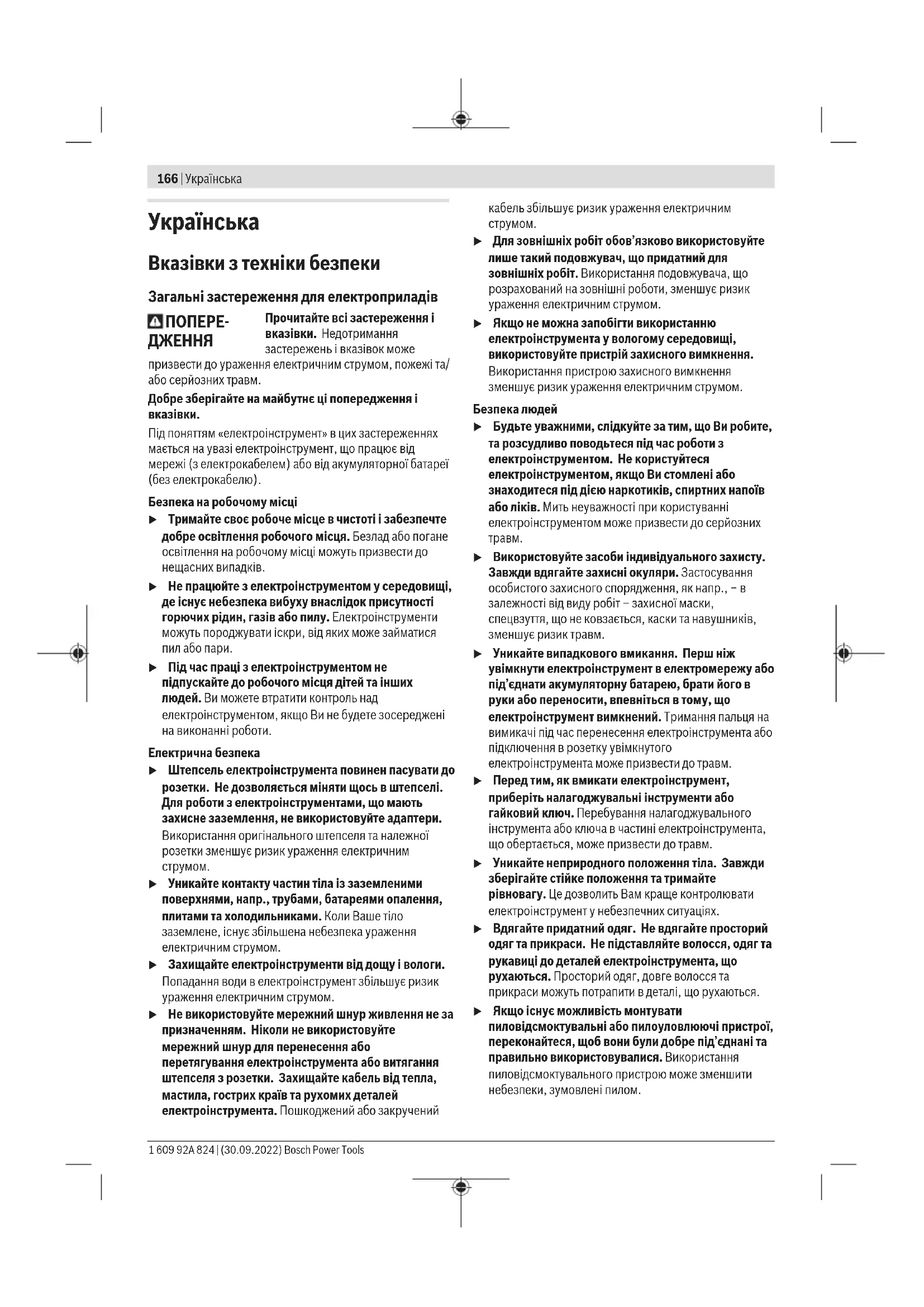 u Ніколи не тримайте руку поблизу від робочого інструмента, що обертається. При сіпанні робочий інструмент може відскочити Вам на руку. u Уникайте своїм корпусом місць, куди в разі сіпання може відскочити електроінструмент. При сіпанні електроінструмент відскакує в напрямку, протилежному руху шліфувального круга в місці застрявання. u Працюйте з особливою обережністю в кутах, на гострих краях тощо. Запобігайте відскакуванню робочого інструмента від оброблюваного матеріалу та його заклинюванню. В кутах, на гострих краях або при відскакуванні робочий інструмент може заклинюватися. Це призводить до втрати контролю або сіпання. u Не використовуйте ланцюгові пиляльні диски та пиляльні диски з зубцями. Таке приладдя часто спричиняе сіпання або втрату контролю над електроінструментом. 1 609 92A 824 | (30.09.2022) Bosch Power ToolsУкраїнська | 169 Особливі вказівки з техніки безпеки для шліфування та відрізання u Використовуйте лише шліфувальні круги, дозволені для цього електроінструмента, та захисний кожух, передбачений для відповідного шліфувального круга. Шліфувальні круги, що не передбачені для цього електроінструменту, не можна достатньою мірою прикрити, тому вони небезпечні. u Вигнуті шліфувальні круги потрібно монтувати таким чином, щоб їх робоча поверхня не виступала за край захисного кожуха. Неправильно монтований шліфувальний круг, що виступає за край захисного кожуха, не можна достатньо захистити. u Захисний кожух треба надійно встановити на електроінструменті та відрегулювати з досягненням максимальної безпеки таким чином, щоб на оператора дивилася якомога менша частина неприкритого шліфувального інструмента. Захисний кожух захищає оператора від уламків, випадкового контакту із шліфувальним інструментом та від іскор, від яких міг би зайнятися одяг. u Шліфувальні круги можна використовувати лише для рекомендованих видів робіт. Наприклад: ніколи не шліфуйте боковою поверхнею відрізного круга. Відрізні круги призначені для знімання матеріалу кромкою круга. Бічне навантаження може зламати такий круг. u Завжди використовуйте для вибраного шліфувального круга непошкоджений затискний фланець відповідного розміру та форми. Придатний фланець підтримує відрізний круг і, таким чином, зменшує небезпеку перелому круга. Фланці для відрізних кругів можуть відрізнятися від фланців для шліфувальних кругів. u Не використовуйте зношені круги, що вживалися на електроінструментах більших розмірів. Призначені для більших електроінструментів круги не розраховані на більшу кількість обертів менших електроінструментів та можуть ламатися. Інші особливі попередження при відрізанні шліфувальним кругом u Уникайте застрявання відрізного круга або занадто сильного натискання. Не робіть занадто глибоких надрізів. Занадто сильне натискання на відрізний круг збільшує навантаження на нього та його схильність до перекосу або застрявання і таким чином збільшує можливість сіпання або ламання шліфувального круга. u Уникайте зони попереду та позаду відрізного круга. Якщо Ви пересуваєте відрізний круг в оброблюваному матеріалі в напрямку від себе, при сіпанні електроінструмент з кругом може відскочити прямо на Вас. u Якщо відрізний круг заклинить або Ви навмисно зупините різання, вимкніть електроінструмент та тримайте його, не рухаючись, поки кр