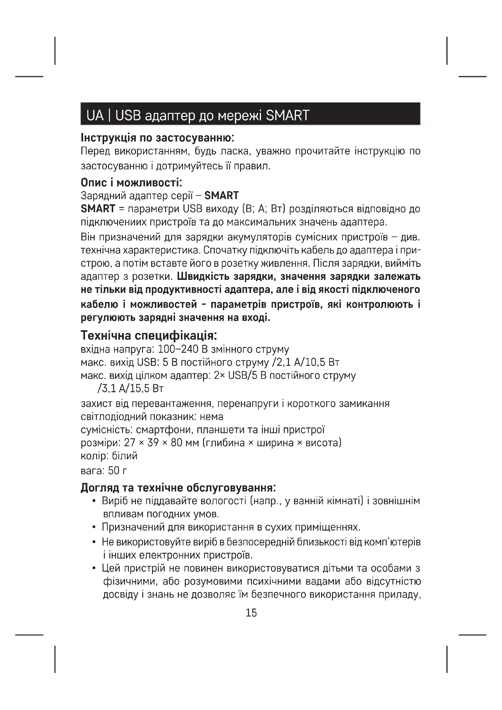 - Vermeiden Sie eine unsachgemäße Bedienung des Gerätes und halten Sie immer die Grundsätze der Verwendung von Elektrogeräten ein. Die Elektroverbraucher nicht als unsortierter Kommunalabfall entsorgen, Sammelstellen für sortierten Abfall bzw. Müll benutzen. Setzen Sie sich wegen aktuellen Informationen über die jeweiligen Sammelstellen mit örtlichen Behörden in Verbindung. Wenn Elektrover- braucher auf üblichen Mülldeponien gelagert werden, können Gefahrstof- fe ins Grundwasser einsickern und in den Lebensmittelumlauf gelangen, Ihre Gesundheit beschädigen und Ihre Gemütlichkeit verderben.15 UA | USB адаптер до мережі SMART Інструкція по застосуванню: Перед використанням, будь ласка, уважно прочитайте інструкцію по застосуванню і дотримуйтесь її правил. Опис і можливості: Зарядний адаптер серії – SMART SMART = параметри USB виходу (В; A; Вт) розділяються відповідно до підключениих пристроїв та до максимальних значень адаптера. Він призначений для зарядки акумуляторів сумісних пристроїв – див. технічна характеристика. Спочатку підключіть кабель до адаптера і при- строю, а потім вставте його в розетку живлення. Після зарядки, вийміть адаптер з розетки. Швидкість зарядки, значення зарядки залежать не тільки від продуктивності адаптера, але і від якості підключеного кабелю і можливостей - параметрів пристроїв, які контролюють і регулюють зарядні значення на вході. Технічна специфікація: вхідна напруга: 100–240 В змінного струму макс. вихід USB: 5 В постійного струму /2,1 A/10,5 Вт макс. вихід цілком адаптер: 2× USB/5 В постійного струму /3,1 A/15,5 Вт захист від перевантаження, перенапруги і короткого замикання світлодіодний показник: нема сумісність: смартфони, планшети та інші пристрої розміри: 27 × 39 × 80 мм (глибина × ширина × висота) колір: білий вага: 50 г Догляд та технічне обслуговування: