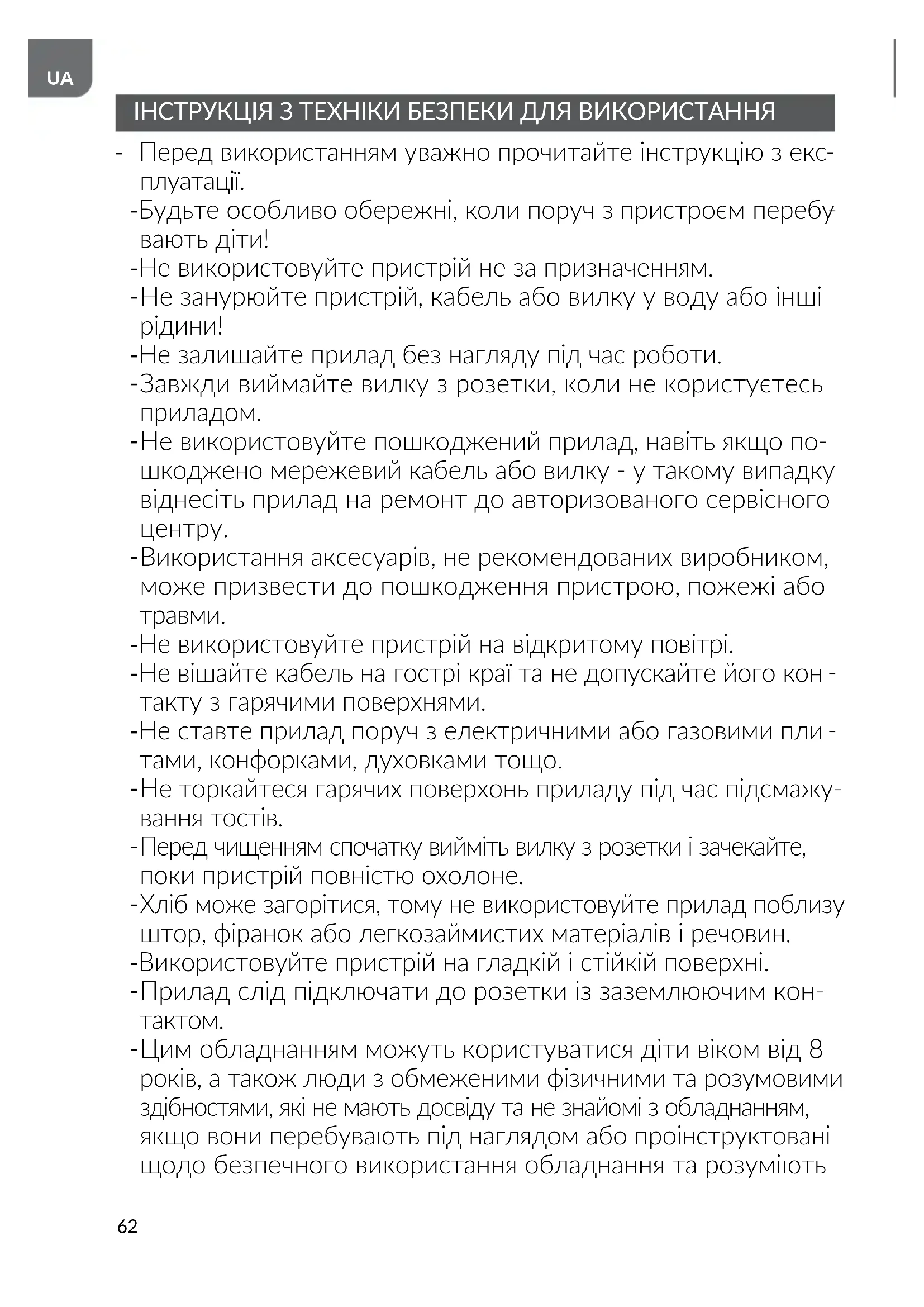 Цим обладнанням можуть користуватися діти віком від 8 років, а також люди з обмеженими фізичними та розумовими здібностями, які не мають досвіду та не знайомі з обладнанням, якщо вони перебувають під наглядом або проінструктовані щодо безпечного використання обладнання та розуміють63