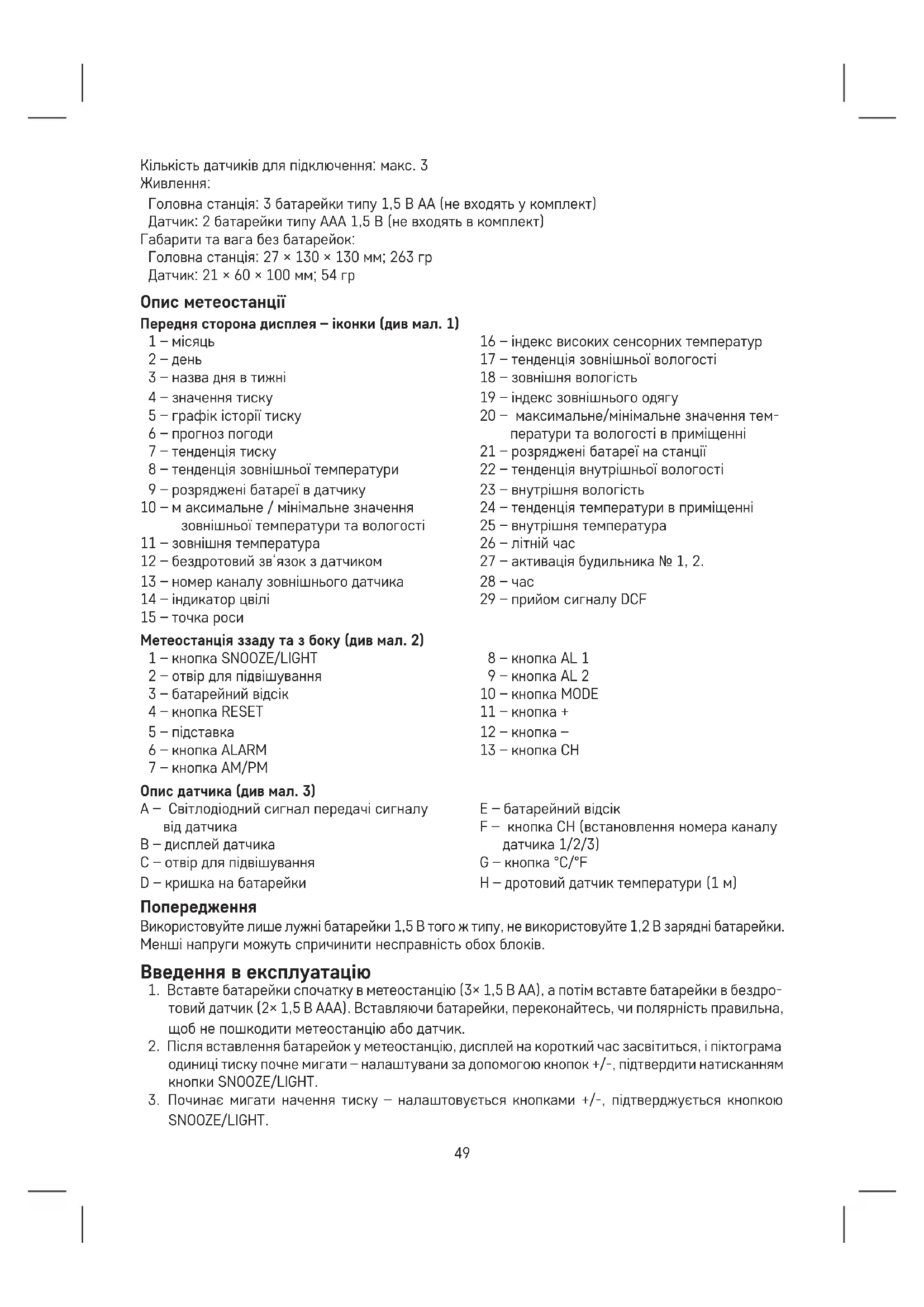 Головна станція: 3 батарейки типу 1,5 В АА (не входять у комплект) Датчик: 2 батарейки типу AAA 1,5 В (не входять в комплект) Габарити та вага без батарейок: Головна станція: 27 × 130 × 130 мм; 263 гp Датчик: 21 × 60 × 100 мм; 54 гр Опис метеостанції Передня сторона дисплея – іконки (див мал. 1) 1 – місяць 2 – день 3 – назва дня в тижні 4 – значення тиску 5 – графік історії тиску 6 – прогноз погоди 7 – тенденція тиску 8 – тенденція зовнішньої температури 9 – розряджені батареї в датчику 10 – м аксимальне / мінімальне значення зовнішньої температури та вологості 11 – зовнішня температура 12 – бездротовий зв‘язок з датчиком 13 – номер каналу зовнішнього датчика 14 – індикатор цвілі 15 – точка роси 16 – індекс високих сенсорних температур 17 – тенденція зовнішньої вологості 18 – зовнішня вологість 19 – індекс зовнішнього одягу 20 – максимальне/мінімальне значення тем- ператури та вологості в приміщенні 21 – розряджені батареї на станції 22 – тенденція внутрішньої вологості 23 – внутрішня вологість 24 – тенденція температури в приміщенні 25 – внутрішня температура 26 – літній час 27 – активація будильника № 1, 2. 28 – час 29 – прийом сигналу DCF Метеостанція ззаду та з боку (див мал. 2) 1 – кнопка SNOOZE/LIGHT 2 – отвір для підвішування 3 – батарейний відсік 4 – кнопка RESET 5 – підставка 6 – кнопка ALARM 7 – кнопка AM/PM 8 – кнопка AL 1 9 – кнопка AL 2 10 – кнопка MODE 11 – кнопка + 12 – кнопка – 13 – кнопка CH Опис датчика (див мал. 3) A – Світлодіодний сигнал передачі сигналу від датчика В – дисплей датчика С – отвір для підвішування D – кришка на батарейки E – батарейний відсік F – кнопка CH (встановлення номера каналу датчика 1/2/3) G – кнопка °C/°F H – дротовий датчик температури (1 м) Попередження Використовуйте лише лужні батарейки 1,5 В того ж типу, не використовуйте 1,2 В зарядні батарейки. Менші напруги можуть спричинити несправність обох блоків. Введення в експлуатацію