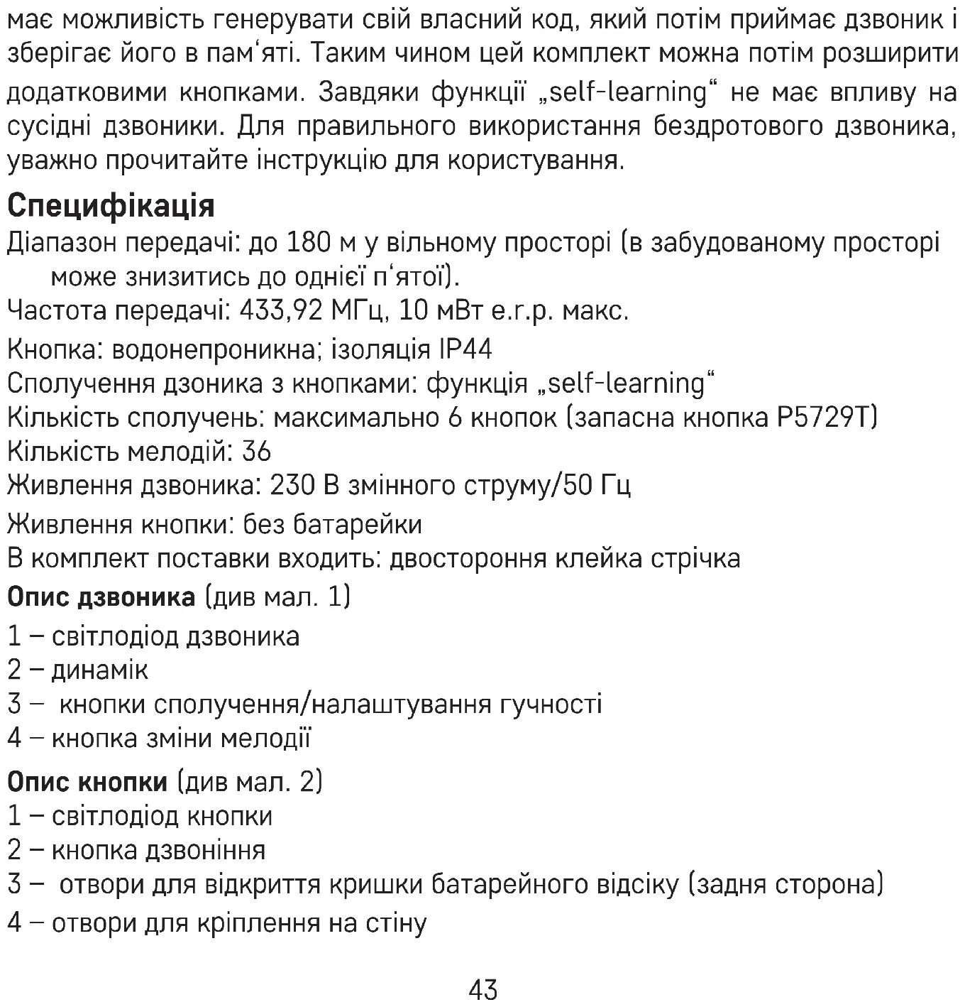 Дзвоник перейде у режим сполучення „self-learning“, котрий триває 25 секунд. Протягом цього часу натисніть кнопку дзвінка, здвінок зазвучить, кнопка є сполучена із дзвоником. Цим автоматично закінчиться режим self-learning.