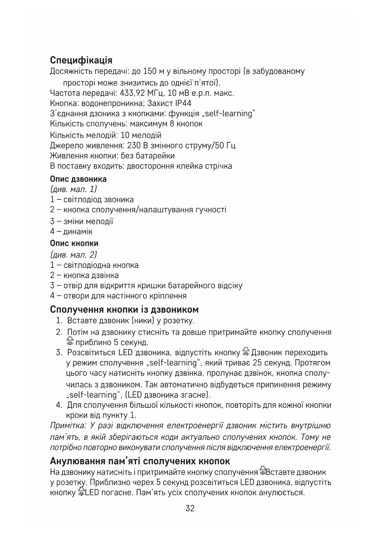 у режим сполучення „self-learning“, який триває 25 секунд. Протягом цього часу натисніть кнопку дзвінка, пролунає дзвінок, кнопка сполу- чилась з дзвоником. Так автоматично відбудеться припинення режиму „self-learning“, (LED дзвоника згасне).