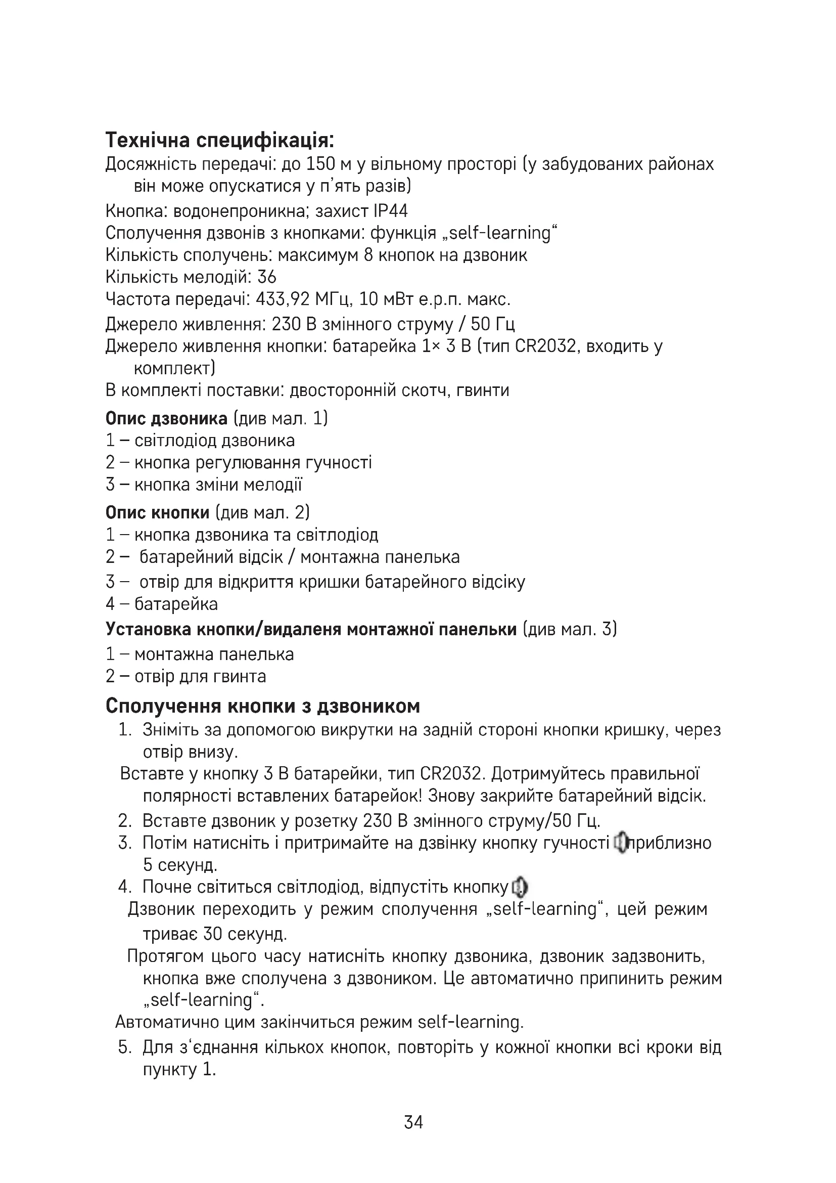Дзвоник переходить у режим сполучення „self-learning“, цей режим триває 30 секунд. Протягом цього часу натисніть кнопку дзвоника, дзвоник задзвонить, кнопка вже сполучена з дзвоником. Це автоматично припинить режим „self-learning“. Автоматично цим закінчиться режим self-learning.