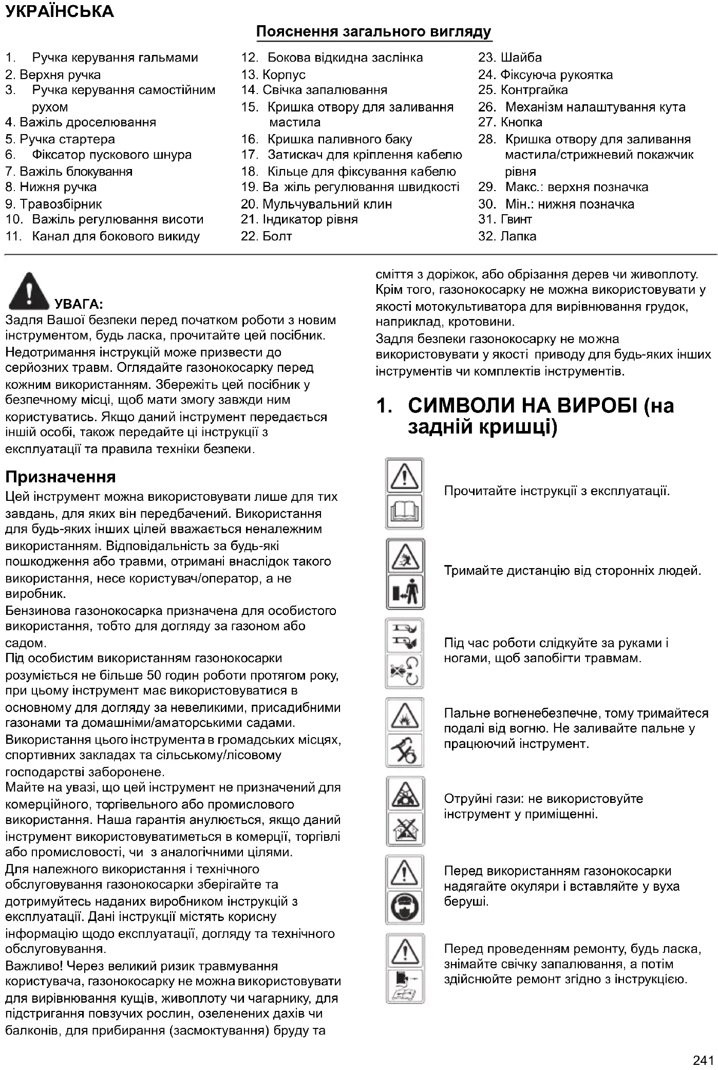 - Використовуйте газонокосарку тільки за умов денного світла або при яскравому штучному освітленні. Застереження: двигун гарячий.243