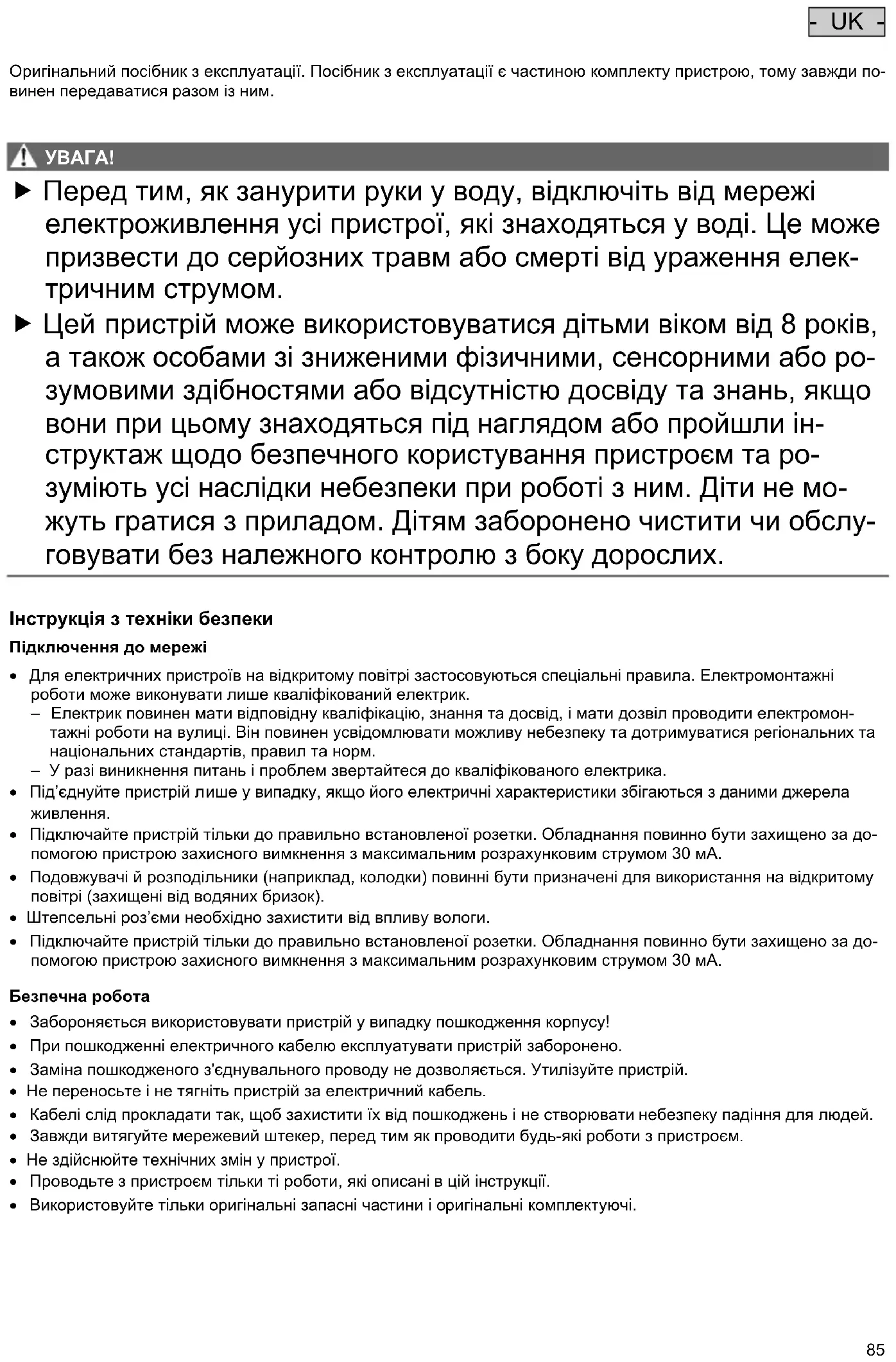 Перед тим, як занурити руки у воду, відключіть від мережі електроживлення усі пристрої, які знаходяться у воді. Це може призвести до серйозних травм або смерті від ураження елек- тричним струмом. Цей пристрій може використовуватися дітьми віком від 8 років, а також особами зі зниженими фізичними, сенсорними або ро- зумовими здібностями або відсутністю досвіду та знань, якщо вони при цьому знаходяться під наглядом або пройшли ін- структаж щодо безпечного користування пристроєм та ро- зуміють усі наслідки небезпеки при роботі з ним. Діти не мо- жуть гратися з приладом. Дітям заборонено чистити чи обслу- говувати без належного контролю з боку дорослих.