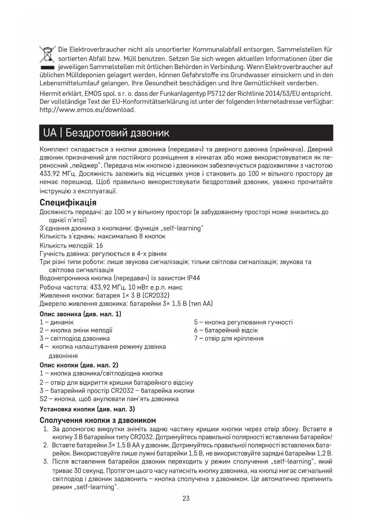 - Geben Sie das Set am Ende der Lebensdauer in einem Geschäft, in dem Sie ein neues Set kaufen, oder an einem dafür vorgesehenen Ort (Sammelplatz usw.) ab.23 Die Elektroverbraucher nicht als unsortierter Kommunalabfall entsorgen, Sammelstellen für sortierten Abfall bzw. Müll benutzen. Setzen Sie sich wegen aktuellen Informationen über die jeweiligen Sammelstellen mit örtlichen Behörden in Verbindung. Wenn Elektroverbraucher auf üblichen Mülldeponien gelagert werden, können Gefahrstoe ins Grundwasser einsickern und in den Lebensmittelumlauf gelangen, Ihre Gesundheit beschädigen und Ihre Gemütlichkeit verderben. Hiermit erklärt, EMOS spol. s r. o. dass der Funkanlagentyp P5712 der Richtlinie 2014/53/EU entspricht. Der vollständige Text der EU-Konformitätserklärung ist unter der folgenden Internetadresse verfügbar: http://www.emos.eu/download. UA | Бездротовий дзвоник Комплект складається з кнопки дзвоника (передавач) та дверного дзвонка (приймача). Дверний дзвоник призначений для постійного розміщення в кімнатах або може використовуватися як пе- реносний „пейджер“. Передача між кнопкою і дзвоником забезпечується радіохвилями з частотою 433,92 МГц. Досяжність залежить від місцевих умов і становить до 100 м вільного простору де немає перешкод. Щоб правильно використовувати бездротовий дзвоник, уважно прочитайте інструкцію з експлуатації. Специфікація Досяжність передачі: до 100 м у вільному просторі (в забудованому просторі може знизитись до однієї п‘ятої) З’єднання дзоника з кнопками: функція „self-learning“ Кількість з’єднань: максимально 8 кнопок Кількість мелодій: 16 Гучність дзвінка: регулюється в 4-х рівнях Три різні типи роботи: лише звукова сигналізація; тільки світлова сигналізація; звукова та світлова сигналізація Водонепроникна кнопка (передавач) із захистом IP44 Робоча частота: 433,92 МГц, 10 мВт е.р.п. макс Живлення кнопки: батарея 1× 3 В (CR2032) Джерело живлення дзвокика: батарейки 3× 1,5 В (тип AA) Опис звоника (див. мал. 1) 1 – динамік 2 – кнопка зміни мелодії 3 – світлодіод дзвоника 4 – кнопка налаштування режиму дзвінка