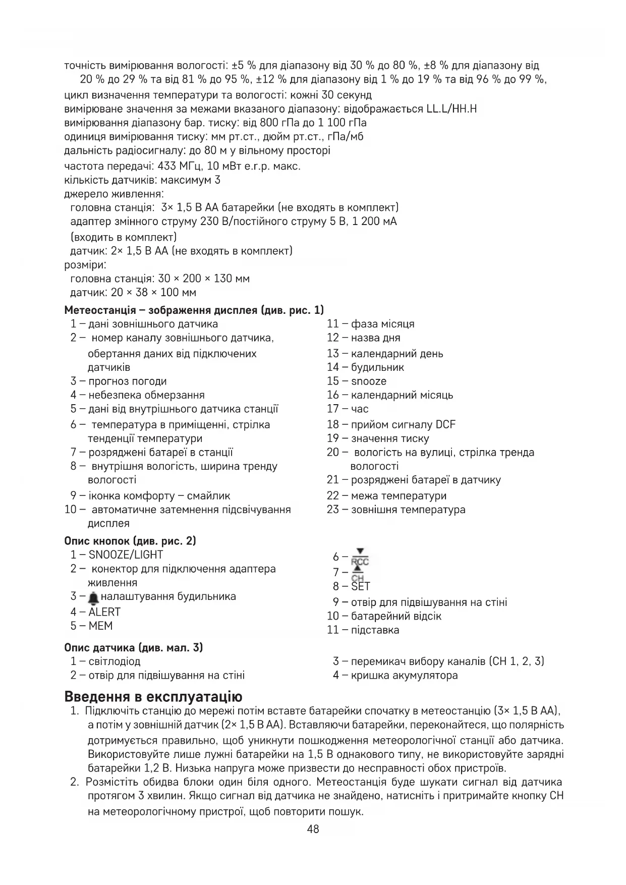 внутрішня та зовнішня вологість: від 1 % до 99 % відносної вологості, роздільна здатність 1 %48 точність вимірювання вологості: ±5 % для діапазону від 30 % до 80 %, ±8 % для діапазону від 20 % до 29 % тa від 81 % до 95 %, ±12 % для діапазону від 1 % до 19 % тa від 96 % до 99 %, цикл визначення температури та вологості: кожні 30 секунд вимірюване значення за межами вказаного діапазону: відображається LL.L/HH.H вимірювання діапазону бар. тиску: від 800 гПа до 1 100 гПа одиниця вимірювання тиску: мм рт.ст., дюйм рт.ст., гПа/мб дальність радіосигналу: до 80 м у вільному просторі частота передачі: 433 МГц, 10 мВт e.r.p. макс. кількість датчиків: максимум 3 джерело живлення: головна станція: 3× 1,5 В AA батарейки (не входять в комплект) адаптер змінного струму 230 В/постійного струму 5 В, 1 200 мА (входить в комплект) датчик: 2× 1,5 В AA (не входять в комплект)
