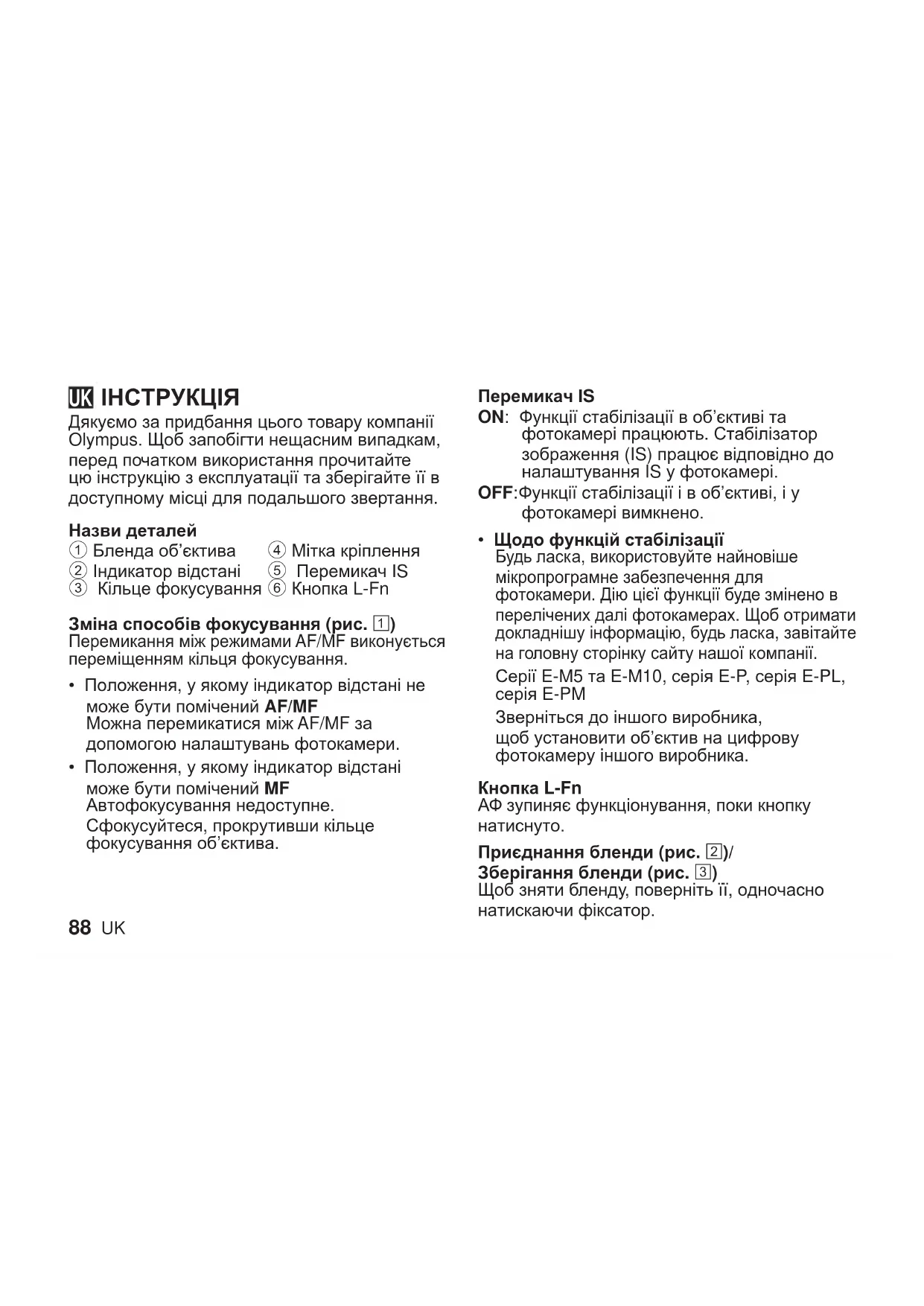 Дякуємо за придбання цього товару компанії Olympus. Щоб запобігти нещасним випадкам, перед початком використання прочитайте цю інструкцію з експлуатації та зберігайте її в доступному місці для подальшого звертання. Назви деталей 1 Бленда об’єктива 2 Індикатор відстані 3 Кільце фокусування 4 Мітка кріплення 5 Перемикач IS 6 Кнопка L-Fn Зміна способів фокусування (рис. 1) Перемикання між режимами AF/MF виконується переміщенням кільця фокусування.