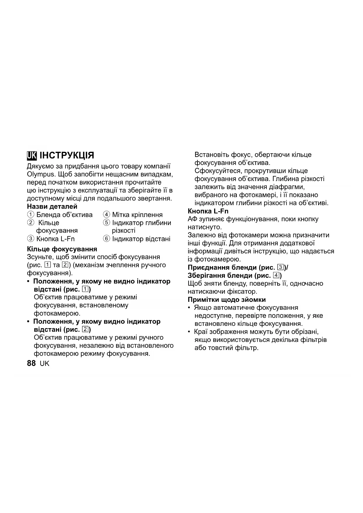 Дякуємо за придбання цього товару компанії Olympus. Щоб запобігти нещасним випадкам, перед початком використання прочитайте цю інструкцію з експлуатації та зберігайте її в доступному місці для подальшого звертання. Назви деталей 1 Бленда об’єктива 2 Кільце фокусування 3 Кнопка L-Fn 4 Мітка кріплення 5 Індикатор глибини