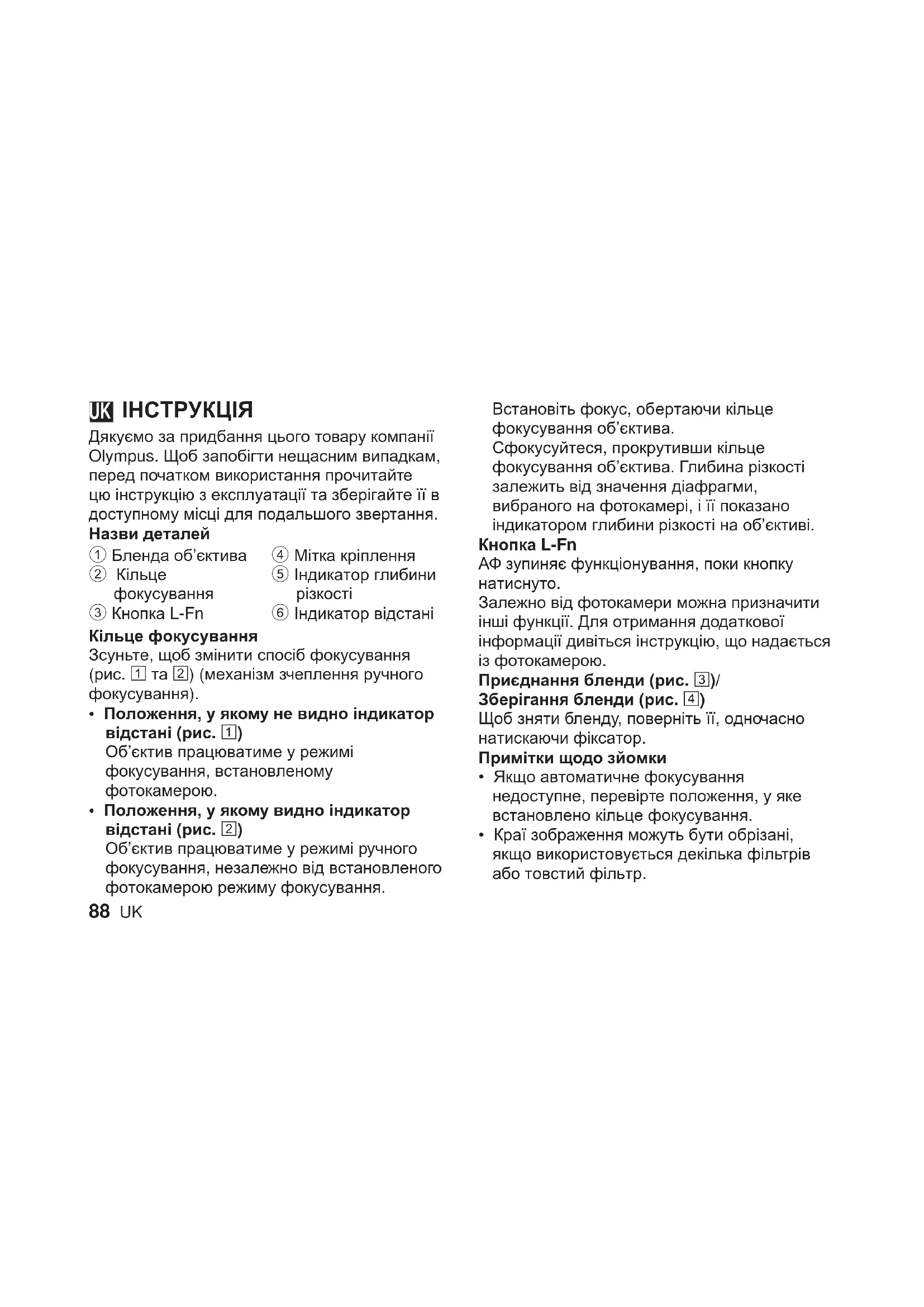 Дякуємо за придбання цього товару компанії Olympus. Щоб запобігти нещасним випадкам, перед початком використання прочитайте цю інструкцію з експлуатації та зберігайте її в доступному місці для подальшого звертання. Назви деталей 1 Бленда об’єктива 2 Кільце фокусування 3 Кнопка L-Fn 4 Мітка кріплення 5 Індикатор глибини