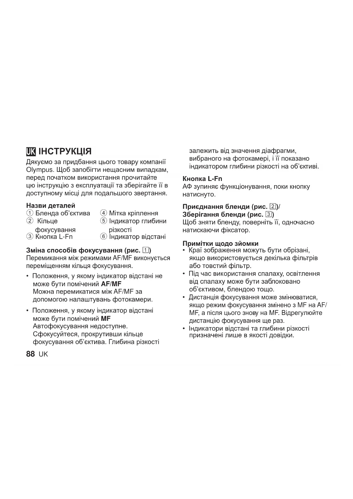 Дякуємо за придбання цього товару компанії Olympus. Щоб запобігти нещасним випадкам, перед початком використання прочитайте цю інструкцію з експлуатації та зберігайте її в доступному місці для подальшого звертання. Назви деталей 1 Бленда об’єктива 2 Кільце фокусування 3 Кнопка L-Fn 4 Мітка кріплення 5 Індикатор глибини