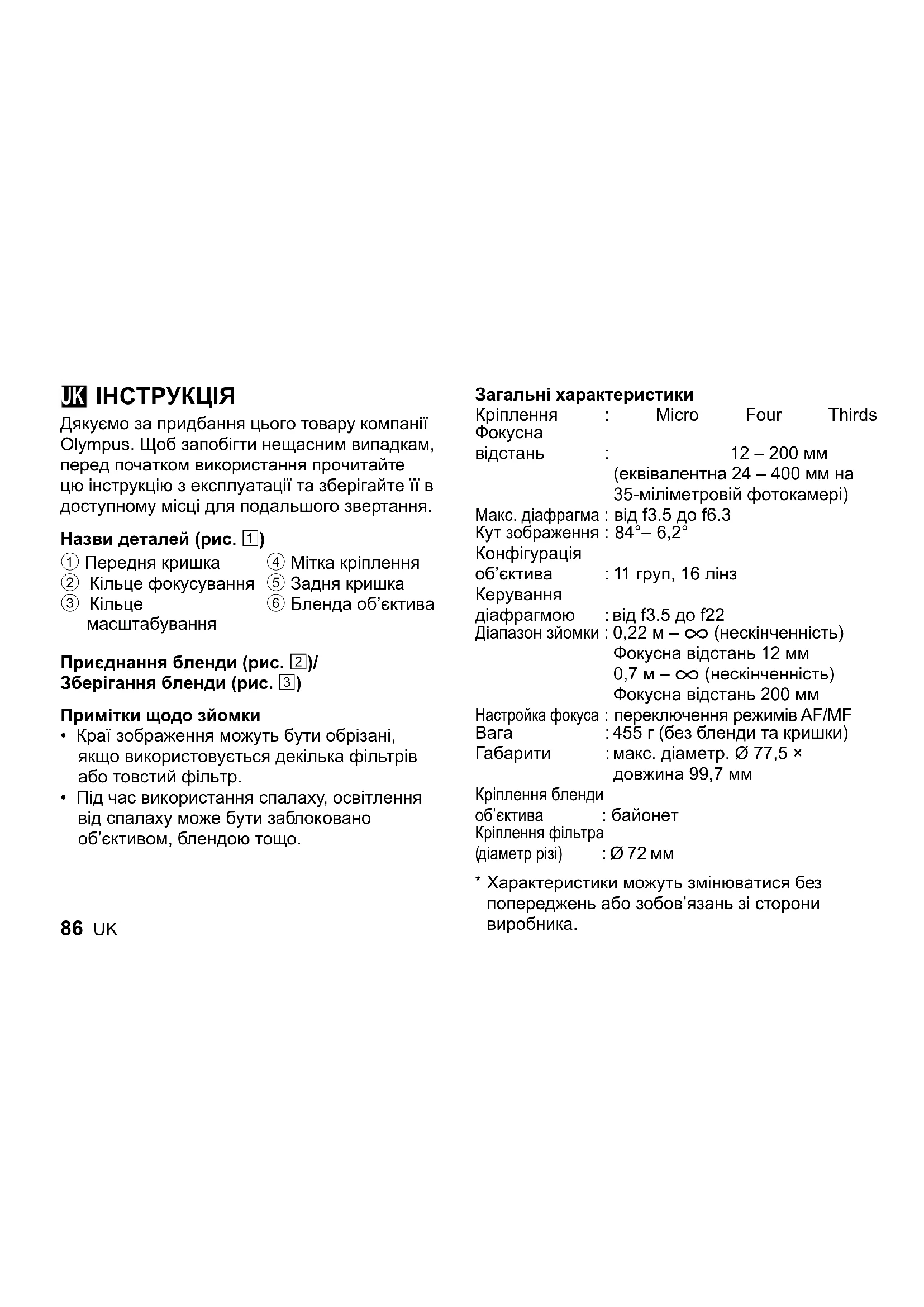 Дякуємо за придбання цього товару компанії Olympus. Щоб запобігти нещасним випадкам, перед початком використання прочитайте цю інструкцію з експлуатації та зберігайте її в доступному місці для подальшого звертання. Назви деталей (рис. 1) 1 Передня кришка 2 Кільце фокусування 3 Кільце масштабування 4 Мітка кріплення 5 Задня кришка 6 Бленда об’єктива Приєднання бленди (рис. 2)/ Зберігання бленди (рис. 3) Примітки щодо зйомки
