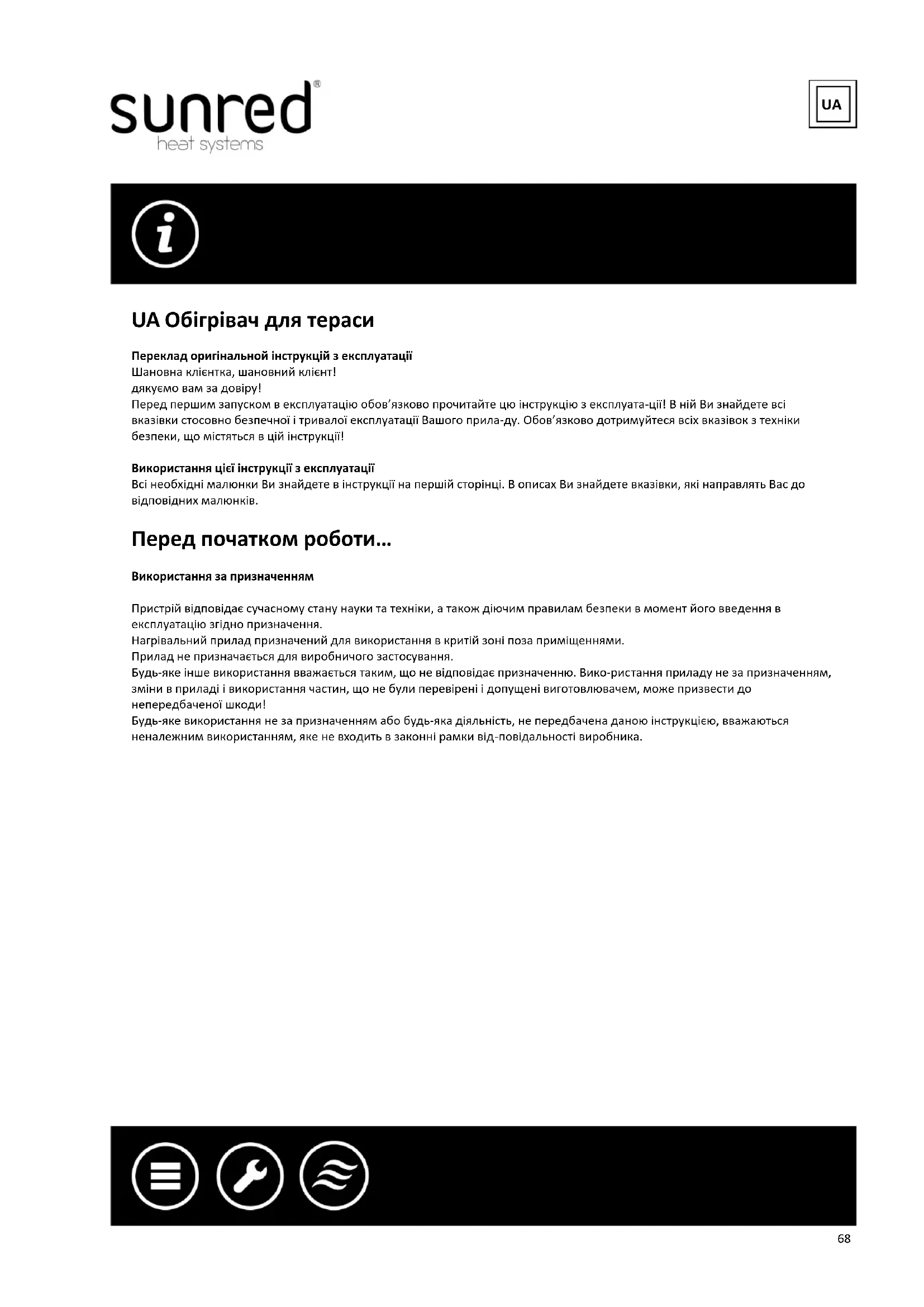 OutTrade B.V. De Gri 1 7711 EP Nieuwleusen The Netherlands Tel: +31-529—48 28 08 Fax: +31-529—48 49 10 info@ourade.eu www.ourade.eu ГАРАНТИЙНЫЙ ТАЛОН Прошу описать дефект: Отсутствие детального описания проблемы может осложнить процесс ремонта и увеличить время, необходимое для ремонта устройства. Если подробно не указать дефекты, это может привести к проблемам с определением проблемы, а иногда и к повторному ремонту.68 UA Обігрівач для тераси Переклад оригінальной інструкцій з експлуатації Шановна клієнтка, шановний клієнт! дякуємо вам за довіру! Перед першим запуском в експлуатацію обов’язково прочитайте цю інструкцію з експлуата-ції! В ній Ви знайдете всі вказівки стосовно безпечної і тривалої експлуатації Вашого прила-ду. Обов’язково дотримуйтеся всіх вказівок з техніки безпеки, що містяться в цій інструкції! Використання цієї інструкції з експлуатації Всі необхідні малюнки Ви знайдете в інструкції на першій сторінці. В описах Ви знайдете вказівки, які направлять Вас до відповідних малюнків. Перед початком роботи… Використання за призначенням Пристрій відповідає сучасному стану науки та техніки, а також діючим правилам безпеки в момент його введення в експлуатацію згідно призначення. Нагрівальний прилад призначений для використання в критій зоні поза приміщеннями. Прилад не призначається для виробничого застосування. Будь-яке інше використання вважається таким, що не відповідає призначенню. Вико-ристання приладу не за призначенням, зміни в приладі і використання частин, що не були перевірені і допущені виготовлювачем, може призвести до непередбаченої шкоди! Будь-яке використання не за призначенням або будь-яка діяльність, не передбачена даною інструкцією, вважаються неналежним використанням, яке не входить в законні рамки від-повідальності виробника. UA69 Для Вашої безпеки Загальні вказівки з техніки безпеки