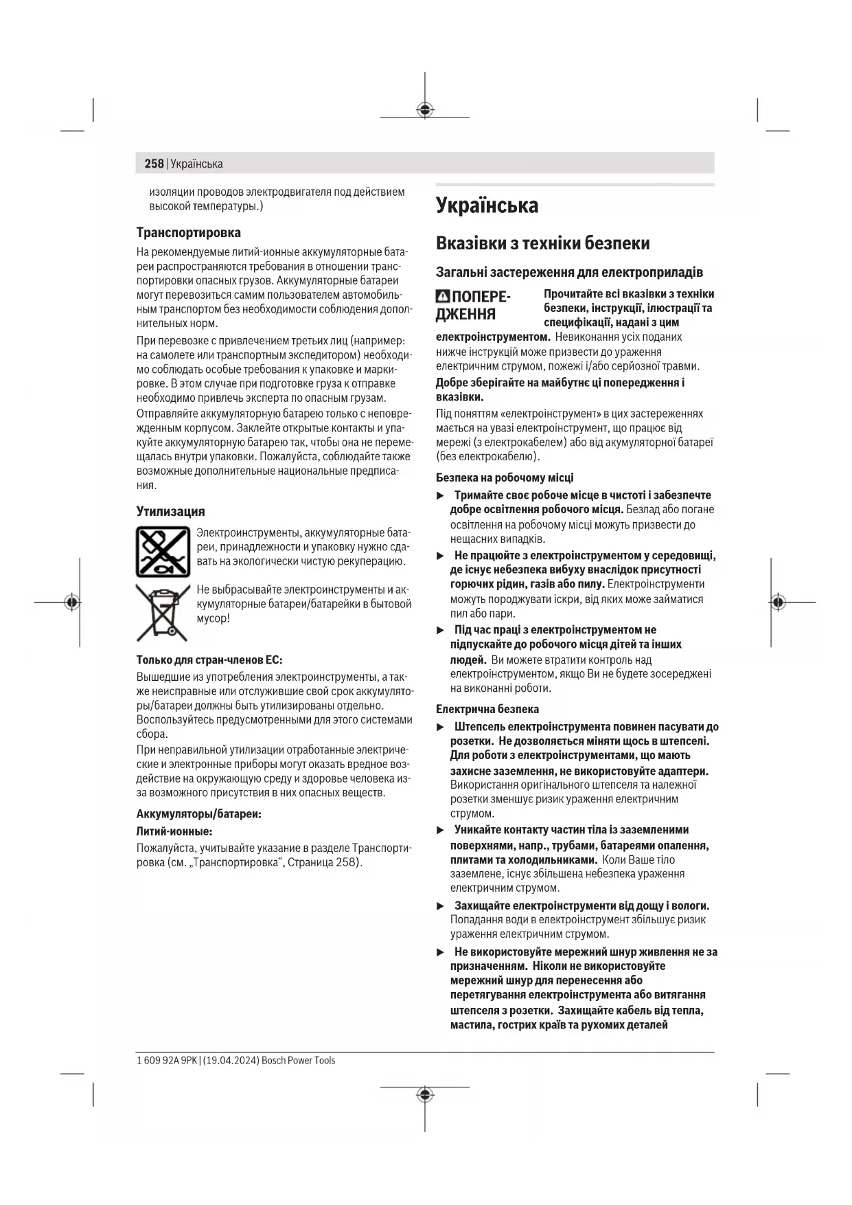 u Тримайте рукоятки і поверхні захвату сухими і чистими, слідкуйте, щоб на них не було оливи або густого мастила. Слизькі рукоятки і поверхні захвату унеможливлюють безпечне поводження з електроінструментом та його контролювання в неочікуваних ситуаціях. Bosch Power Tools 1 609 92A 9PK | (19.04.2024)260 | Українська Правильне поводження та користування електроінструментами, що працюють на акумуляторних батареях u Заряджайте акумуляторні батареї лише в заряджувальних пристроях, рекомендованих виготовлювачем. Використання заряджувального пристрою для акумуляторних батарей, для яких він не передбачений, може призводити до пожежі. u Використовуйте в електроінструментах лише рекомендовані акумуляторні батареї. Використання інших акумуляторних батарей може призводити до травм та пожежі. u Не зберігайте акумуляторну батарею, якою Ви саме не користуєтеся, поряд із канцелярськими скріпками, ключами, цвяхами, гвинтами та іншими невеликими металевими предметами, які можуть спричинити перемикання контактів. Коротке замикання між контактами акумуляторної батареї може спричиняти опіки або пожежу. u При неправильному використанні з акумуляторної батареї може потекти рідина. Уникайте контакту з нею. При випадковому контакті промийте відповідне місце водою. Якщо рідина потрапила в очі, додатково зверніться до лікаря. Акумуляторна рідина може спричиняти подразнення шкіри або