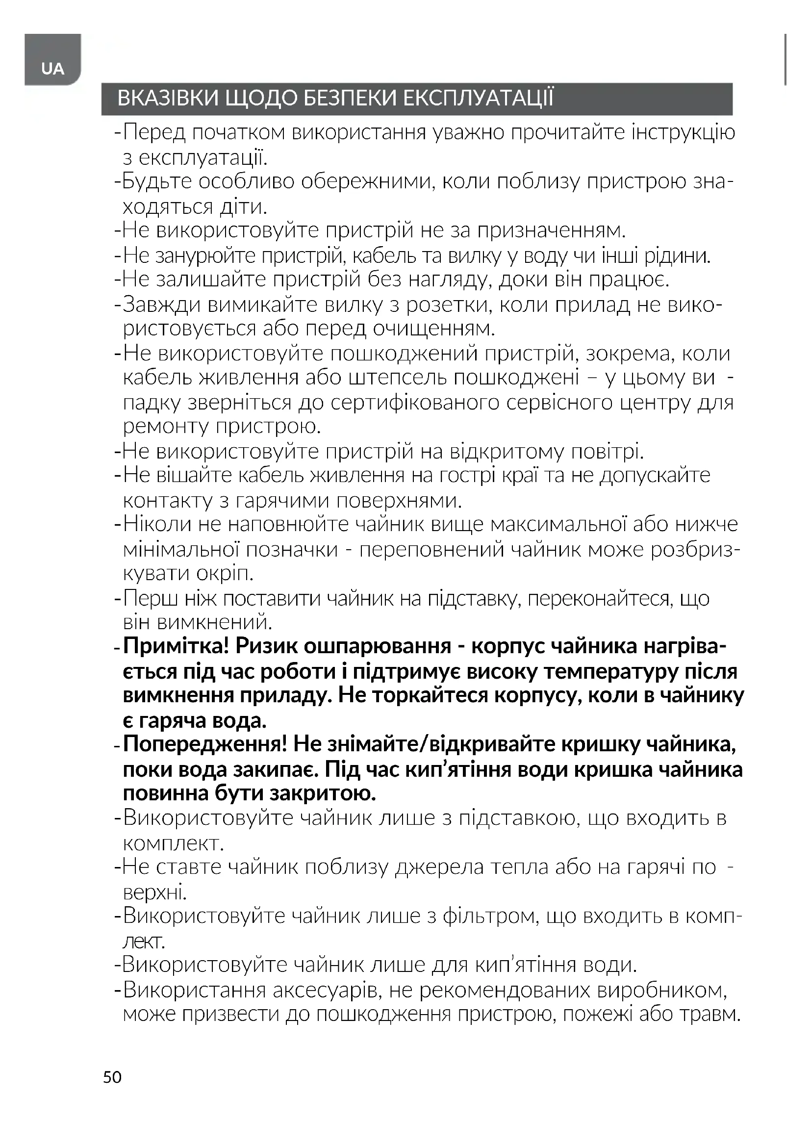 Примітка! Ризик ошпарювання - корпус чайника нагріва- ється під час роботи і підтримує високу температуру після вимкнення приладу. Не торкайтеся корпусу, коли в чайнику є гаряча вода.