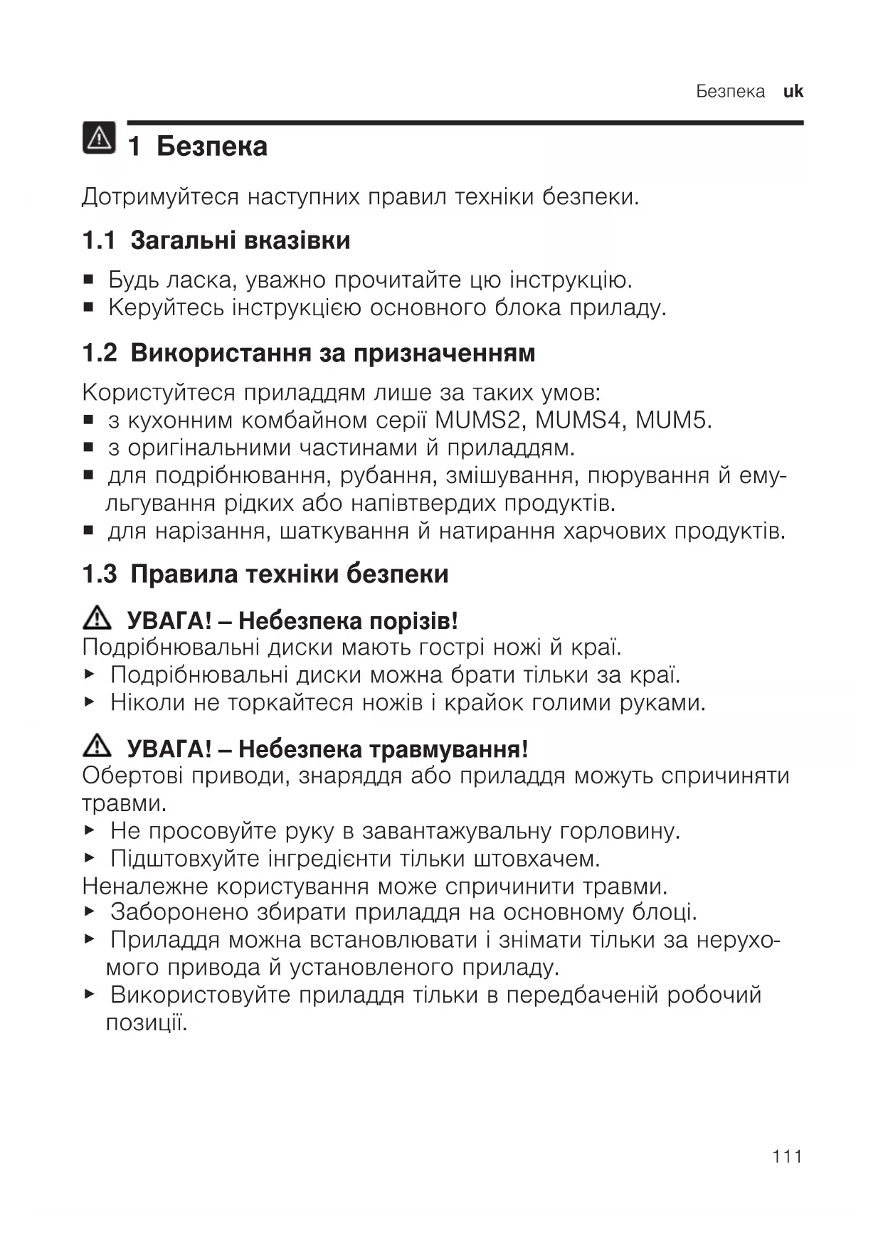 1 Безпека Дотримуйтеся наступних правил техніки безпеки. 1.1 Загальні вказівки ¡ Будь ласка, уважно прочитайте цю інструкцію. ¡ Керуйтесь інструкцією основного блока приладу. 1.2 Використання за призначенням Користуйтеся приладдям лише за таких умов: ¡ з кухонним комбайном серії MUMS2, MUMS4, MUM5. ¡ з оригінальними частинами й приладдям. ¡ для подрібнювання, рубання, змішування, пюрування й ему- льгування рідких або напівтвердих продуктів. ¡ для нарізання, шаткування й натирання харчових продуктів. 1.3 Правила техніки безпеки УВАГА!‒Небезпека порізів! Подрібнювальні диски мають гострі ножі й краї. ▶ Подрібнювальні диски можна брати тільки за краї. ▶ Ніколи не торкайтеся ножів і крайок голими руками. УВАГА!‒Небезпека травмування! Обертові приводи, знаряддя або приладдя можуть спричиняти