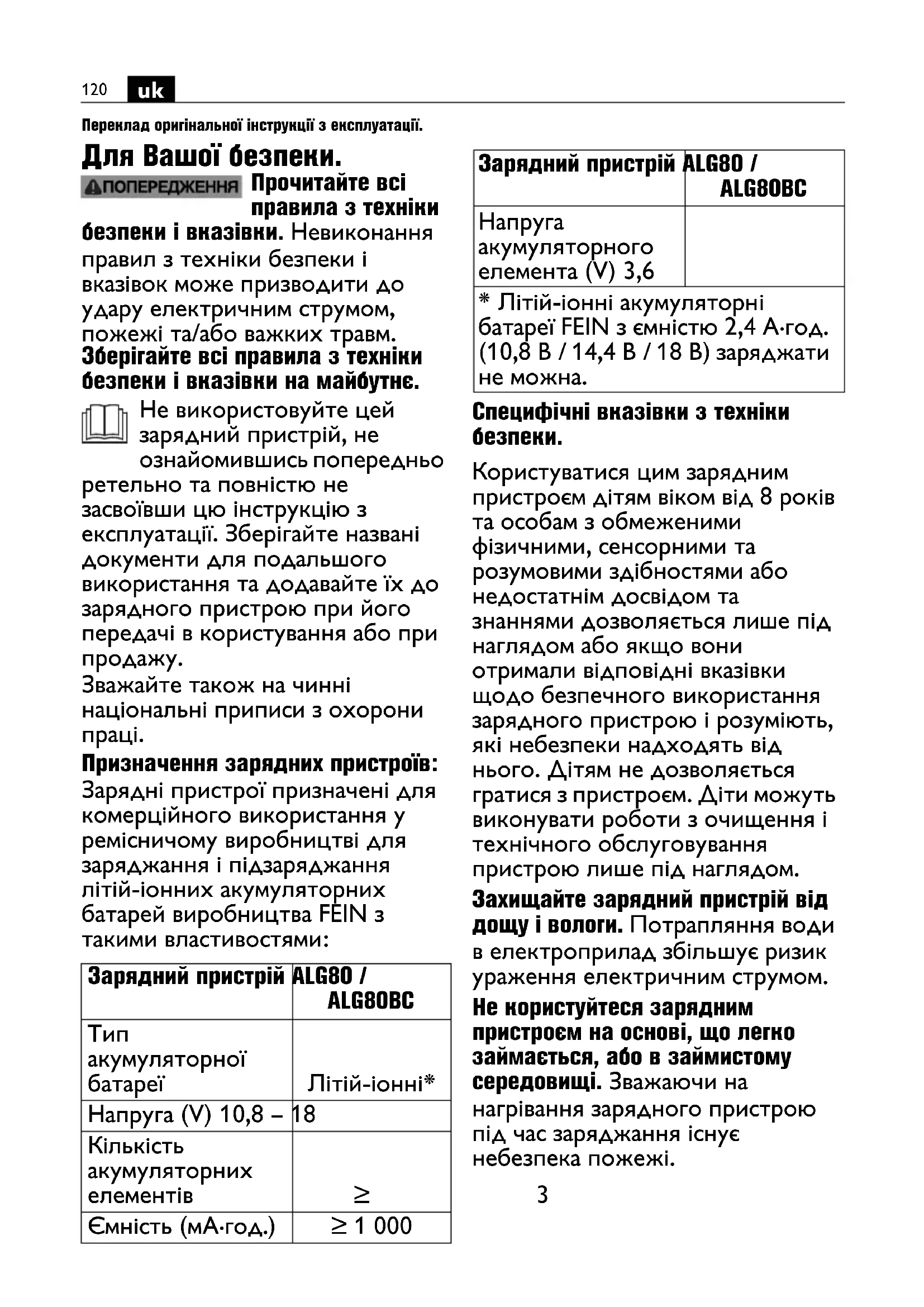 Користуватися цим зарядним пристроєм дітям віком від 8 років та особам з обмеженими фізичними, сенсорними та розумовими здібностями або недостатнім досвідом та знаннями дозволяється лише під наглядом або якщо вони отримали відповідні вказівки щодо безпечного використання зарядного пристрою і розуміють, які небезпеки надходять від нього. Дітям не дозволяється гратися з пристроєм. Діти можуть виконувати роботи з очищення і технічного обслуговування пристрою лише під наглядом. Захищайте зарядний пристрій від дощу і вологи. Потрапляння води в електроприлад збільшує ризик ураження електричним струмом. Не користуйтеся зарядним пристроєм на основі, що легко займається, або в займистому середовищі. Зважаючи на нагрівання зарядного пристрою під час заряджання існує небезпека пожежі. Зарядний пристрій ALG80 / ALG80BC