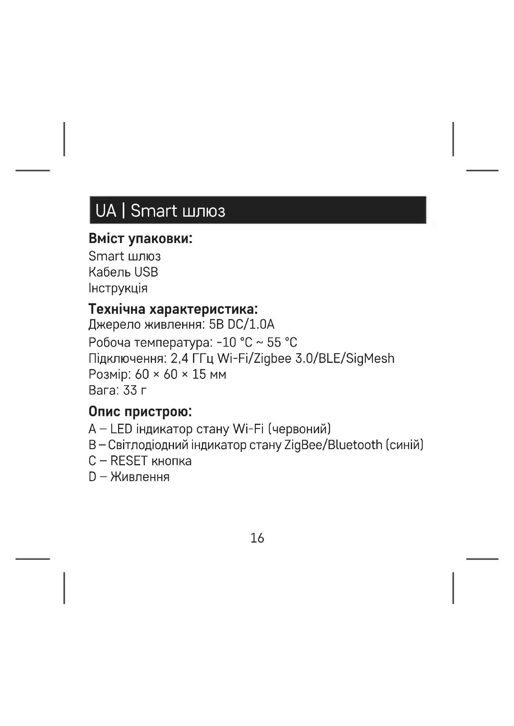 UA | Smart шлюз Вміст упаковки: Smart шлюз Кабель USB