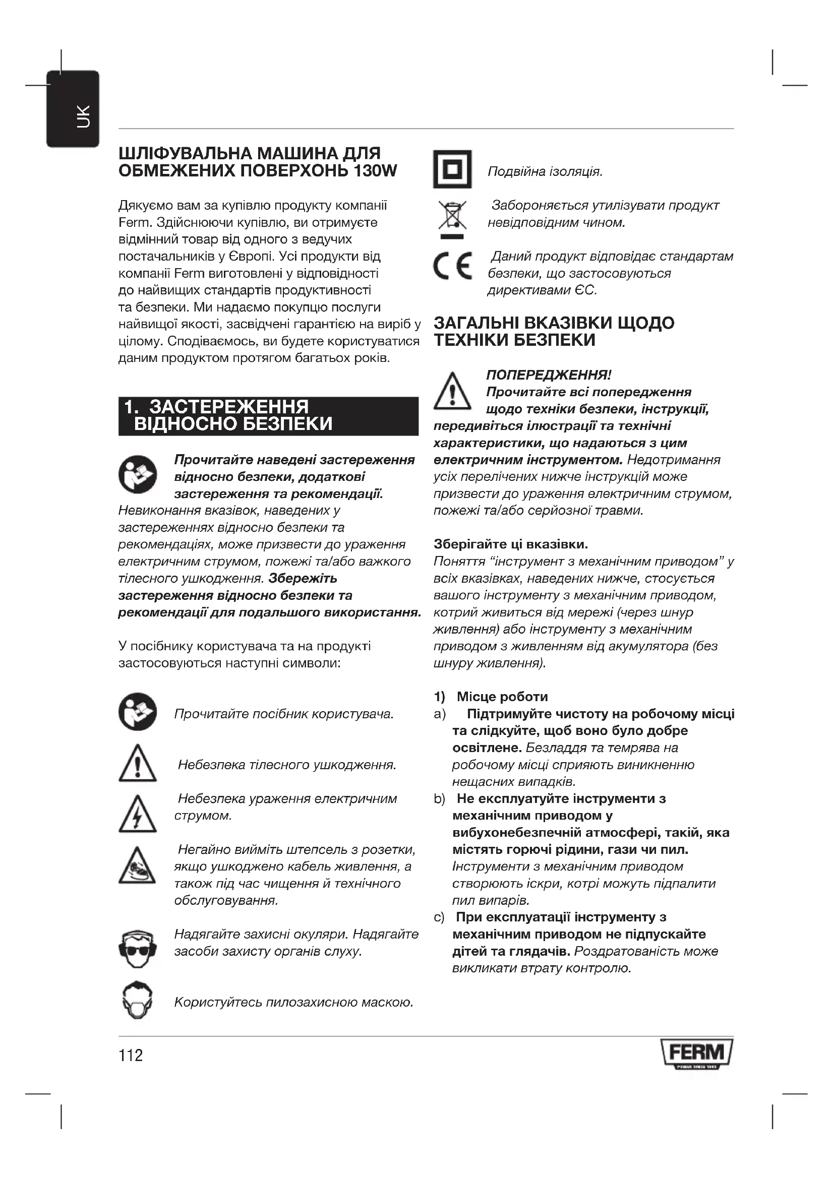 ШЛІФУВАЛЬНА МАШИНА ДЛЯ ОБМЕЖЕНИХ ПОВЕРХОНЬ 130W Дякуємо вам за купівлю продукту компанії Ferm. Здійснюючи купівлю, ви отримуєте відмінний товар від одного з ведучих постачальників у Європі. Усі продукти від компанії Ferm виготовлені у відповідності до найвищих стандартів продуктивності та безпеки. Ми надаємо покупцю послуги найвищої якості, засвідчені гарантією на виріб у цілому. Сподіваємось, ви будете користуватися даним продуктом протягом багатьох років.